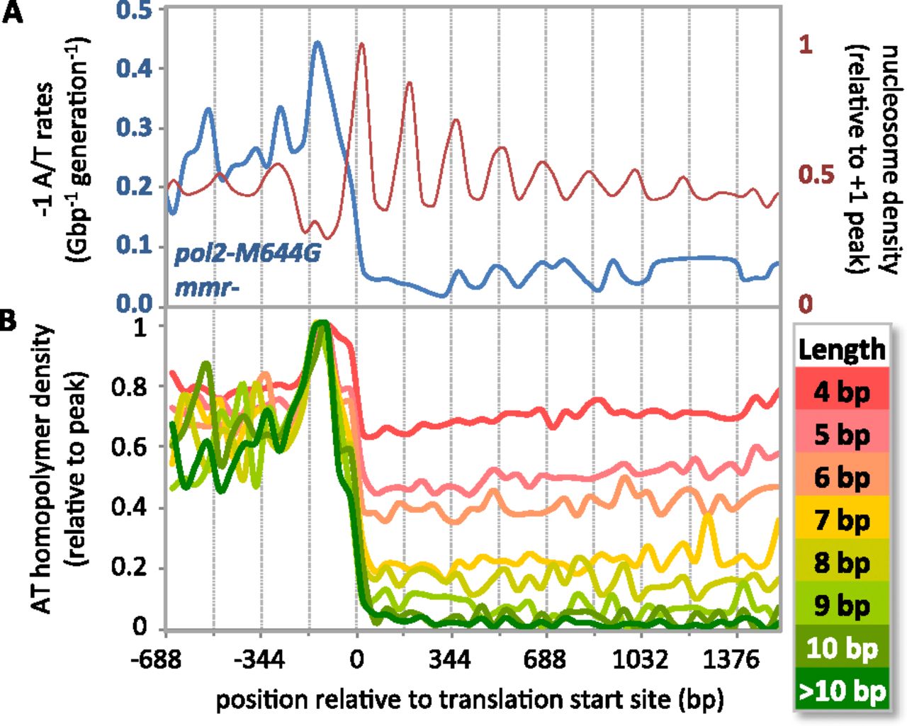 Indel rates in homopolymers in the absence of MMR. (A) A comparison of nucleosome density (red; relative to the +1 peak) and pol2-M644G mmr- AT deletion rates (blue) as a function of distance from translation start sites. (B) Homopolymer densities (relative to maximum density) for various homopolymer lengths as a function of distance from translation start sites.