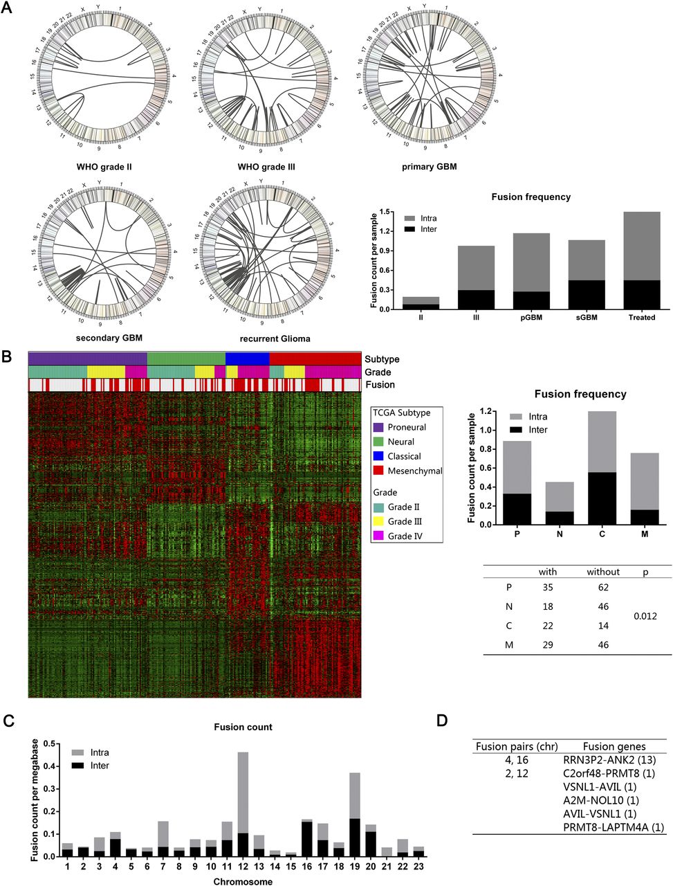 Fusion distribution depending on WHO classification, Cancer Genome Atlas subtypes, or chromosomes. (A) Circos plot of genomic distribution of fusion genes in grade II, grade III, primary GBM, secondary GBM, and recurrent gliomas. (B) Fusion distribution in the four Cancer Genome Atlas subtypes. There was a distinct higher proportion of patients with fusion in a classical subtype (P = 0.012). (C) Genomic distribution of fusion genes, indicating that chromosome 12 was a hot spot for intrachromosome fusion. (D) For the interchromosome fusion detection, chromosomes 4 and 6 and chromosomes 2 and 12 were the fusion pairs with the most interchromosome fusion frequency.