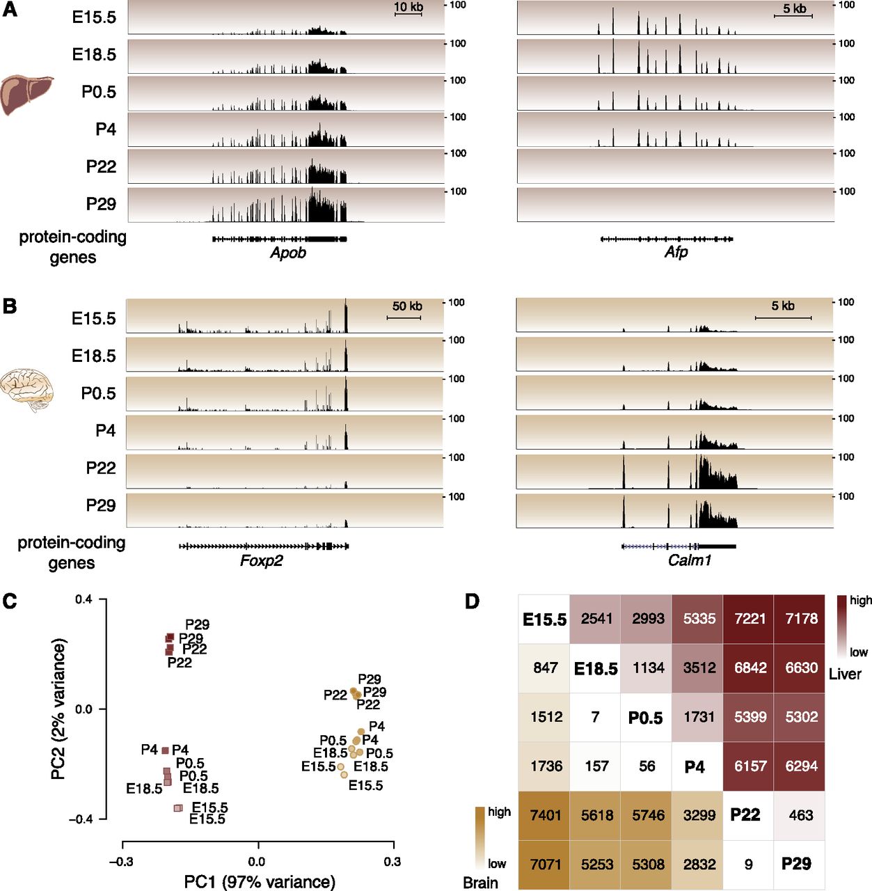 Protein-coding genes are differentially expressed in developing mouse liver and brain. Representative examples of protein-coding gene expression during development are (A) total RNA-seq reads mapping to Apob and Afp genes in liver and (B) Foxp2 and Calm1 genes in brain. The y-axis of each track specifies normalized read density. The scale bar shows length of genomic regions in kilobases (kb). (C) Factorial map of the principal component (PC) analysis of global protein-coding gene expression levels in liver (red) and brain (yellow) tissues. The proportion of variance explained by each principal component is indicated in parentheses. Color gradient indicates developmental stage (light: young; dark: old). (D) The intersection of the row/column for each developmental stage combination shows the number of differentially expressed protein-coding genes between the respective stages in liver (top right triangle) and brain (bottom left triangle) (0.1% FDR).