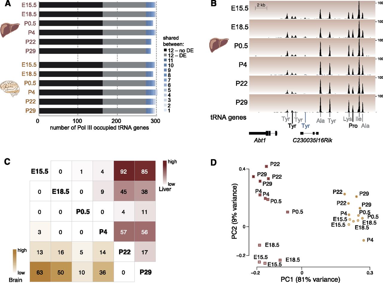 tRNA genes are differentially expressed during mouse development. (A) Stacked bar graph representing total number of expressed tRNA genes in developing mouse liver and brain tissue. Black (no differential expression) and gray (differential expression) represent number of tRNA genes expressed in all stages and tissues. In blue are tRNA genes that are shared between one and 11 stages. (B) Pol III binding to tRNA genes for the same genomic region during mouse liver development. Different colors of tRNA gene identifiers correspond to those used in A. The y-axis of each track specifies normalized read density. Scale bar shows length of genomic regions in kilobases (kb). (C) The intersection of the row/column for each developmental stage combination shows the number of differentially expressed tRNA genes in liver (top right triangle) and brain (bottom left triangle) (0.1% FDR). (D) Factorial map of the principal component (PC) analysis of tRNA gene expression levels in liver (red) and brain (yellow). The proportion of variance explained by each principal component is indicated in parentheses. Color gradient indicates developmental stage (light: young; dark: old).