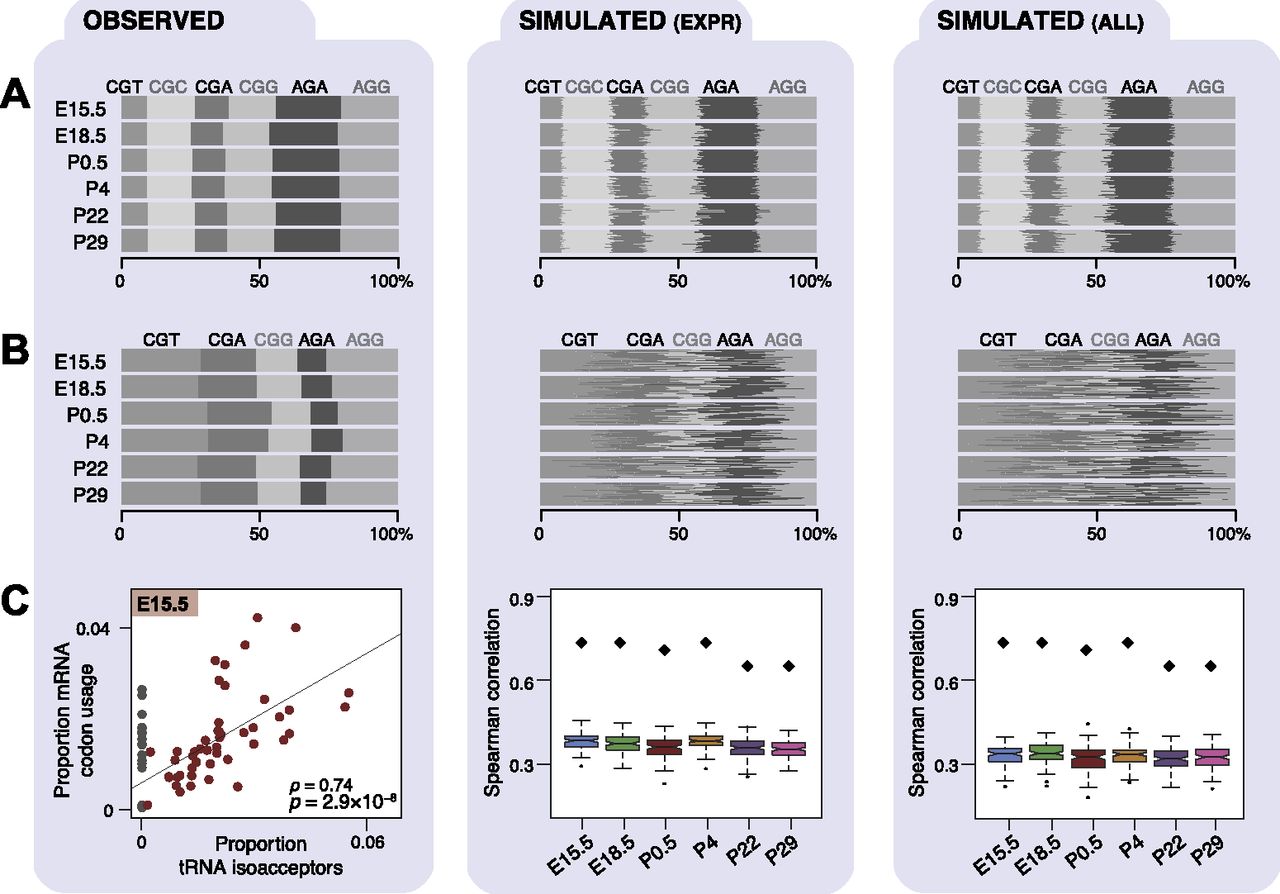 Codon and anticodon usage in transcriptomes across mouse development. Each panel (A–C) consists of three columns: experimentally observed data (left), simulated patterns of transcription randomized among either the expressed genes (middle), or all genomically encoded genes (right). Transcriptomes of each developmental stage were simulated 100 times (Methods). Proportional frequencies weighted by transcript expression are shown for arginine triplet codons as a bar plot (A), where gray shading is by triplet codon. Proportional frequencies weighted by Pol III binding are shown for arginine isoacceptors as a bar plot (B). (C) Plots show Spearman’s rank correlation coefficients (ρ) and P-values (P) of Pol III binding to tRNA isoacceptors (x-axis) and transcriptomic codon frequencies weighted by expression obtained from mRNA-seq data in E15.5 liver (experimentally observed data) and all six developmental stages (simulated data). Anticodon isoacceptors that are not encoded in the mouse genome (gray dots in C) were excluded from calculating the correlation coefficients. Observed correlations across all stages are indicated by black diamonds in plot C, middle and left panels.