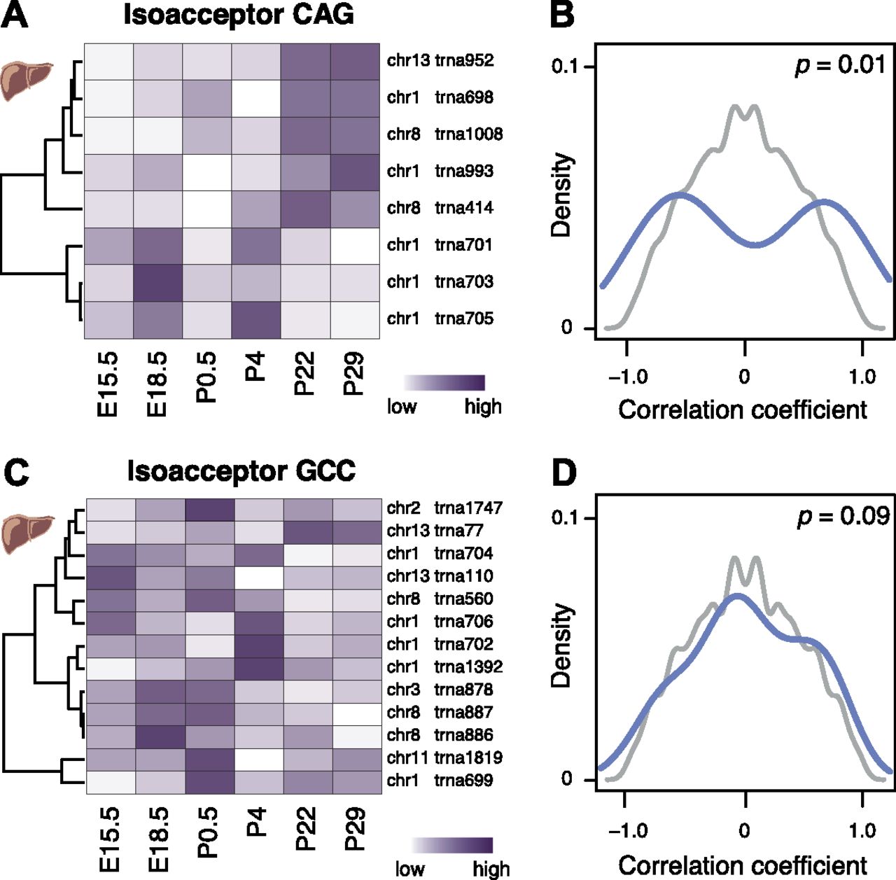 tRNA gene expression is compensated on the isoacceptor level during mouse development. Anticodon isoacceptor Leu(CAG) (A) and Gly(GCC) (C) illustrate a strong and weak correlation of tRNA gene expression level, respectively. Each row of the heatmap represents relative expression levels of tRNA genes across different developing mouse liver stages (white, low = 0; purple, high = 1). Density plots (B,D) represent the distribution of pairwise correlation coefficients between each tRNA gene’s expression levels during mouse liver development for anticodon isoacceptor (B) Leu(CAG) and (D) Gly(GCC) (blue). Background distributions (gray) are derived by permuting the order of stages when computing the pairwise correlation between tRNA genes. P-values (P, χ2-test) are reported in top right of each panel.