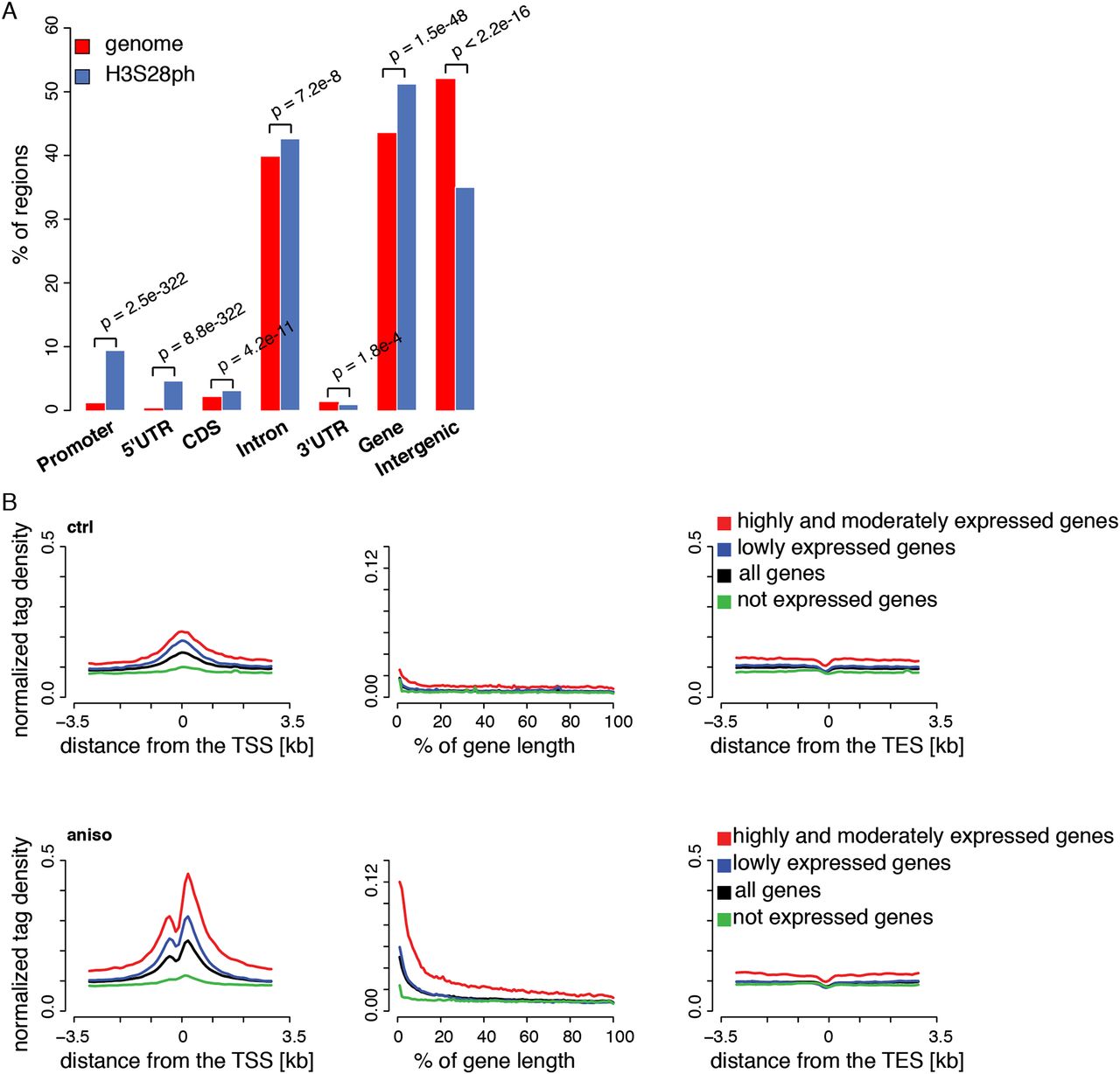 Stress-induced H3S28ph targets active promoters. (A) Enrichment of H3S28ph ChIP-seq regions over six gene features compared with the genome background. “Promoter” is defined as the region located within 1 kb upstream of the annotated transcription start site (TSS). “CDS” refers to the coding sequence. “Gene” consists of 5′UTR, coding exons, introns, and 3′UTR. “Intergenic” refers to all regions located outside of genes extended by 1 kb from both gene ends. The significance of the observed enrichment was determined by a one-sided binomial test. (B) Average density plots of normalized H3S28ph ChIP-seq tags centered at transcription start sites (TSS, left panel), transcription end sites (TES, right panel) for a control (ctrl), and stress-induced state (aniso). (Middle panel) The metagene profile of H3S28ph ChIP-seq densities. The genes are grouped according to their expression level: highly and moderately expressed (in red; ctrl: 3429 genes, aniso: 3181 genes), lowly expressed (in blue; ctrl: 7271 genes, aniso: 7369 genes), and not expressed (in green; ctrl: 10,908 genes, aniso: 11,059 genes). The average profile derived from all genes is depicted in black. The classification of the genes is based on mRNA-seq data (see Supplemental Methods and Supplemental Fig. 4B).