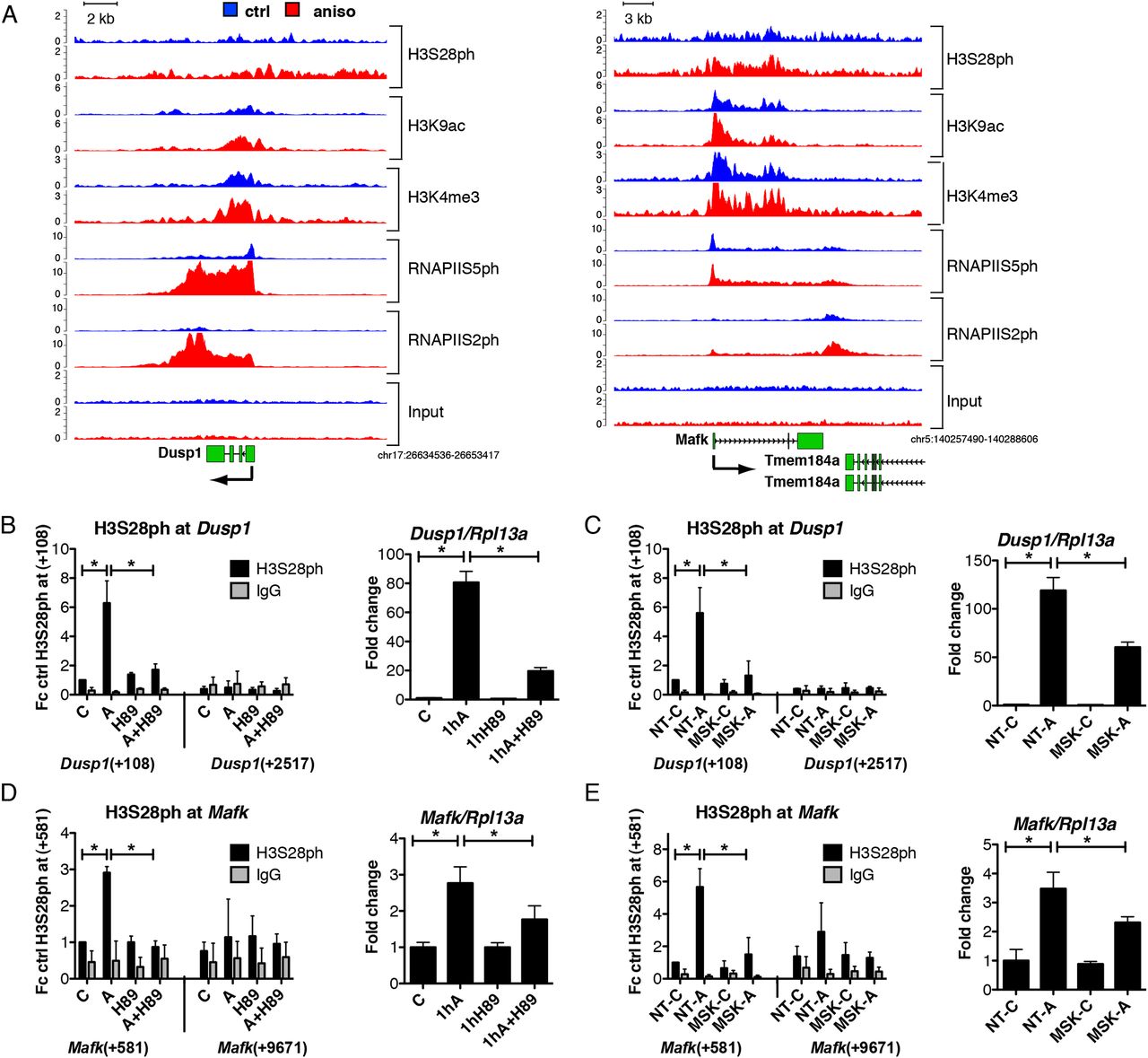 Stress-induced deposition of H3S28ph is dependent on MSK1/2 activity. (A) Genome browser representations of H3S28ph, H3K9ac, H3K4me3, RNAPIIS5ph, and RNAPIIS2ph normalized tag density profiles of representative genes (Dusp1 and Mafk) up-regulated after 1 h of treatment with anisomycin. The profiles derived from untreated cells are depicted in blue and profiles of cells under stress-induced conditions are shown in red. (B,D) ChIP-qPCR analysis of stress-induced H3S28ph levels upon MSK1/2 inhibition with H89 at Dusp1 and Mafk genes (left panels); and RT-qPCR analysis of mRNA expression of Dusp1 and Mafk genes (right panels) in control (C) and anisomycin-treated cells (A) in the absence or presence of H89. Error bars represent SDs (n = 3). (*) P < 0.05. (C,E) ChIP-qPCR analysis of stress-induced H3S28ph in knockdown control (NT) and Rpska5 knockdown (MSK) cells at Dusp1 and Mafk genes (left panels); and RT-qPCR analysis of mRNA expression of Dusp1 and Mafk genes (right panels) upon anisomycin treatment in knockdown control (NT) and Rpska5 knockdown (MSK) cells. Error bars represent SDs (n = 3). (*) P < 0.05. Knockdown efficiency is shown in Supplemental Figure 10B–D.