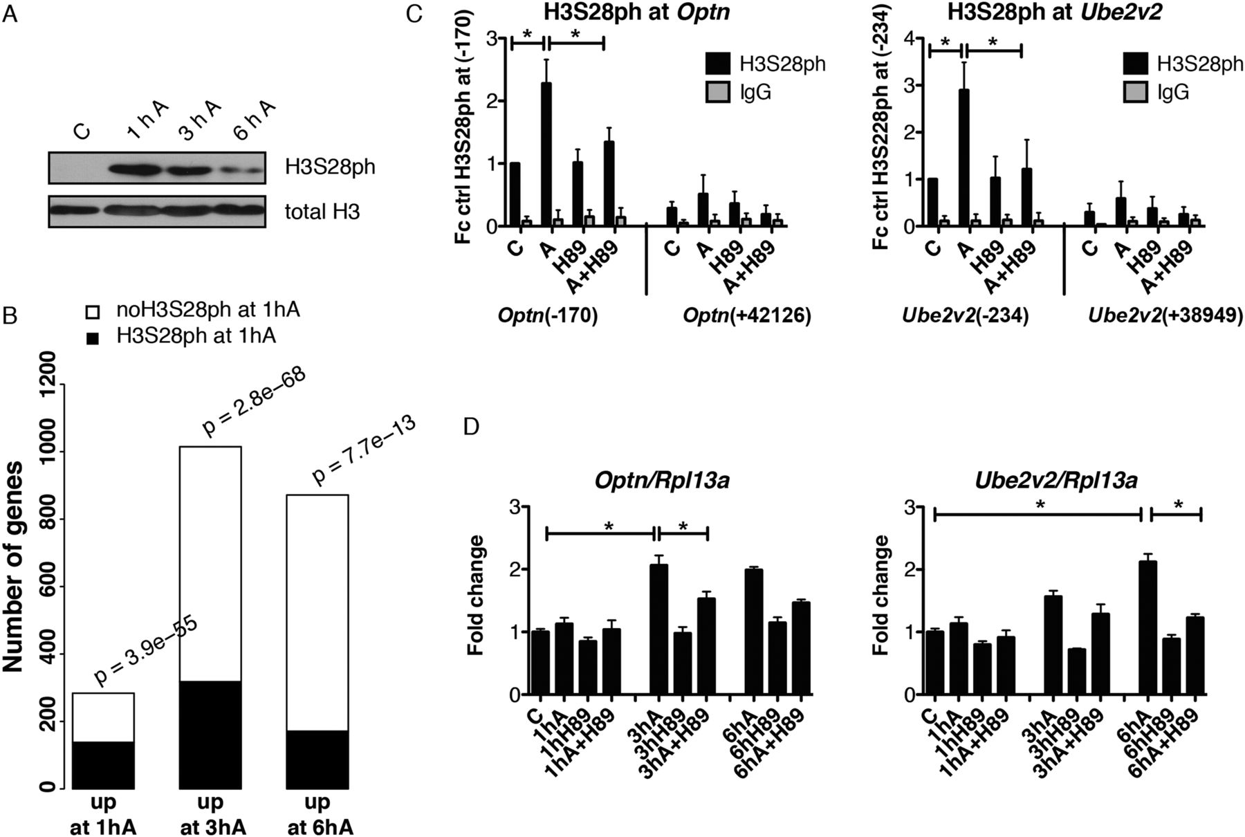 A subset of H3S28ph target genes is primed for later activation. (A) Western blot analysis of H3S28ph levels in serum deprived mouse Swiss 3T3 fibroblasts treated with anisomycin for 1, 3, and 6 h. H3 C-terminus antibody was used as a loading control. (B) Barplot showing the overlap between genes associated with H3S28ph after 1 h of anisomycin treatment and genes up-regulated after 1, 3, and 6 h after stress induction. P-values were calculated using a hypergeometric test. (C) ChIP-qPCR analysis of stress-induced H3S28ph at Optn and Ube2v2 genes in control (C) and anisomycin-treated cells (A) in the absence or presence of H89. Error bars represent SDs (n = 3). (*) P < 0.05. (D) RT-qPCR analysis of Optn and Ube2v2 gene expression after 1, 3, and 6 h of anisomycin treatment in the absence and presence of H89. Error bars represent SDs (n = 3). (*) P < 0.05.