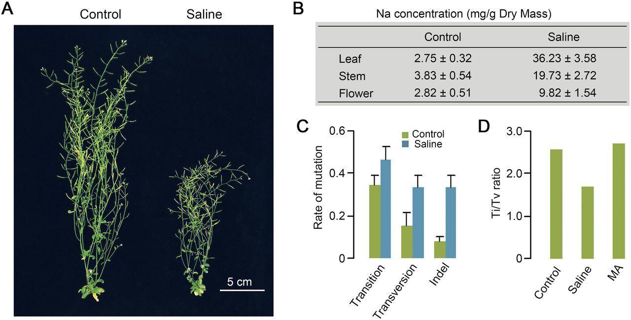 The morphological, physiological, and mutational effects of saline soil on A. thaliana. (A) Retarded growth of 10-wk-old A. thaliana (Col-0) plants growing on Saline (versus Control) soil. (B) Sodium (Na) content in rosette leaves (Leaf), inflorescence stems (Stem), and flowers with immature siliques (Flower) of four 8-wk-old plants grown in Control or Saline soil. Results are triplicate measurements of two biological replicates. (C) Rates (per genome per generation) of Transition, Transversion, and Indel (1–226 bp) (Supplemental Table S3) mutations accumulated in lineages grown for 10 successive generations on Saline or Control soil. Error bars represent standard error of the mean. (D) Transition/Transversion ratios (Ti/Tv) of single base substitutions accumulated in lineages grown for 10 successive generations on Control or Saline soil. For comparison, the Ti/Tv ratio characteristic of mutations accumulating in Control soil in a previous experiment (MA) is also shown (Ossowski et al. 2010).