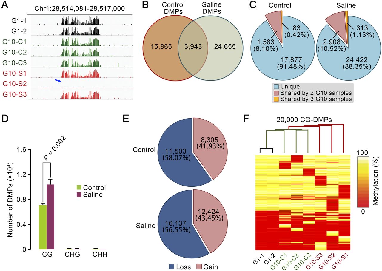 Multigenerational propagation on saline soil increases the accumulation of differentially methylated CG positions (CG-DMPs) in MA lineages. (A) IGV (Integrated Genome Viewer) (see Methods) views of methylation level differentials. Column height indicates the relative extent of methylation at individual cytosine positions in G1 (black), saline soil G10 (red), and control G10 (green) genome samples on a specific region of chromosome 1. The blue arrow indicates a cluster of differentially methylated cytosine positions (DMPs) where methylation has been lost in sample G10-S2. (B) Number and overlap of DMPs detected in G10 control (Control DMPs) and saline soil (Saline DMPs) samples. (C) Frequency of DMP sharing within control (Control) versus saline soil (Saline) treatments. “Shared” refers to DMPs shared within (rather than between) treatments (Control or Saline). (D) Comparison of the number of DMPs at CG, CHG, and CHH sites in G10 saline soil (Saline) and control samples. Results shown are means ±SD. (E) Percentages of DMPs due to loss or gain of methylation in G10 samples. Data from each group (Control or Saline soil) were combined. (F) Hierarchical clustering of samples based on selected sets of 20,000 sites drawn randomly from CG-DMPs identified in all samples.