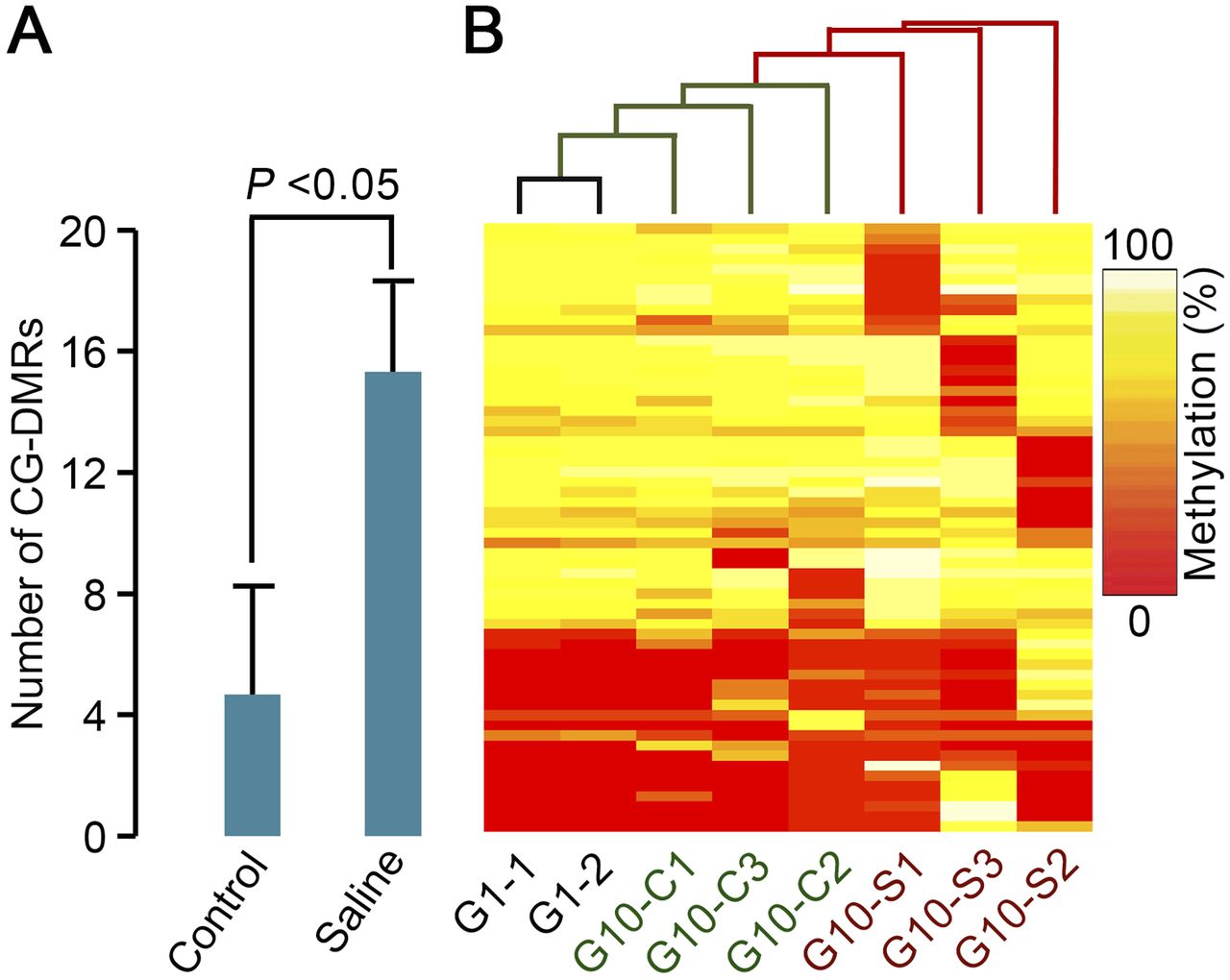 Multigenerational propagation on saline soil increases the accumulation of regional clusters of differentially methylated CG positions (CG-DMRs). (A) Comparison of the number of regional clusters of differentially methylated CG positions (CG-DMRs) (as defined in Methods) identified in saline soil (Saline) and control G10 plant genome samples. Results shown are means ±SD. (B) Hierarchical clustering of samples based on identified CG-DMRs.