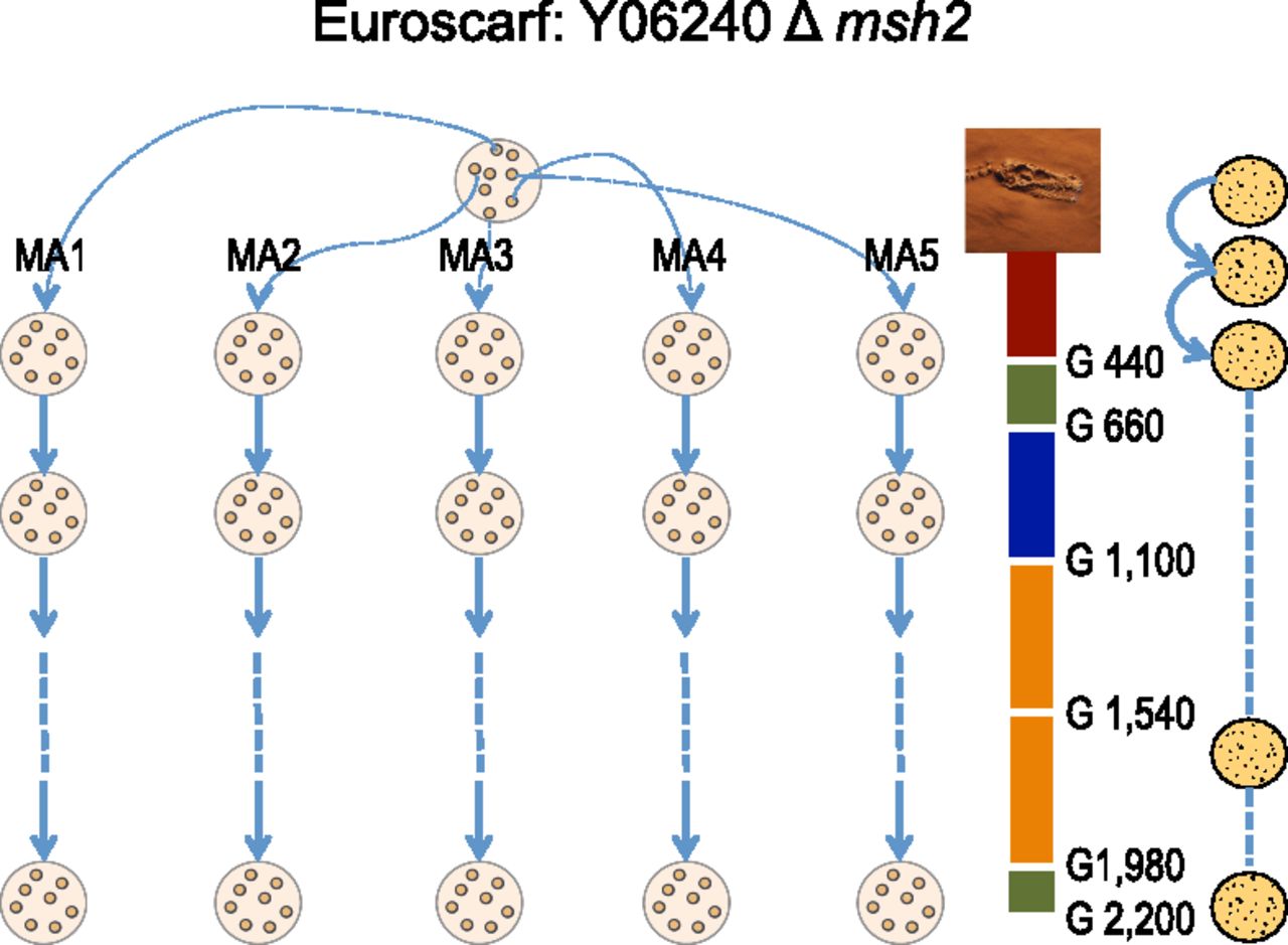 The evolution experiment of the Saccharomyces cerevisiae haploid Δmsh2 strain. We started five independent evolution experiments from a single ancestral colony. Every 48 h, we randomly picked one colony and transferred it to another plate. The experiment involved 100 passages, corresponding to roughly 2200 generations (G) of S. cerevisiae. Single colonies were isolated for genome sequencing at passages 20, 30, 50, 70, 90, and 100, and growth was assayed at those time points of the experiment. Every 10 passages, a single colony was frozen at −80°C, obtaining a yeast fossil record.