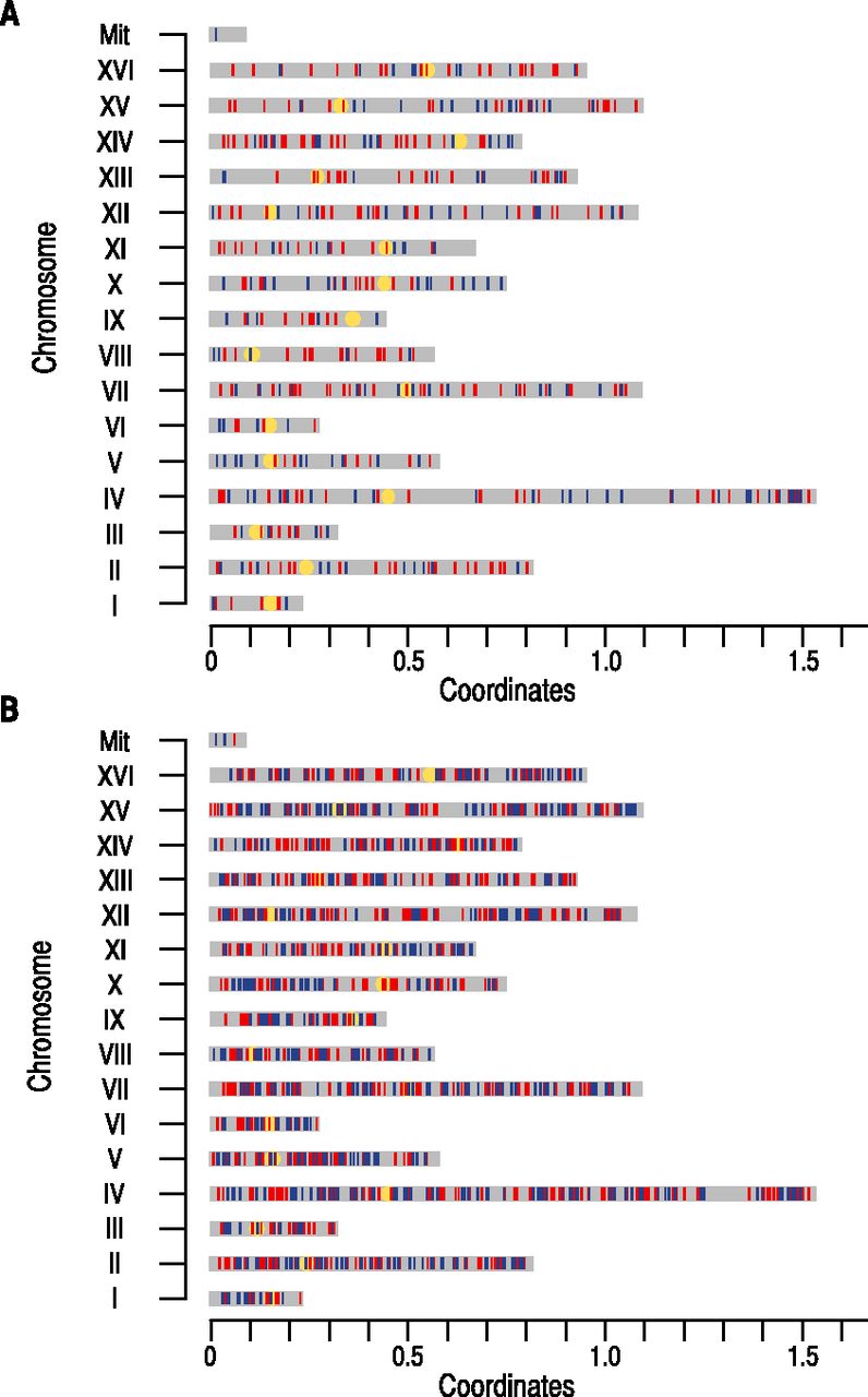 Genome-wide distribution of single nucleotide polymorphisms (SNPs) along the experimental evolution of Saccharomyces cerevisiae in singletons (blue vertical lines) and duplicates (red vertical lines). (A) Distribution of nonsynonymous SNPs (NSNPs) in protein coding regions of singletons and duplicates in the 16 S. cerevisiae chromosomes (chromosomes I to XVI). (B) Distribution of SNPs in the promoter regions of singletons and duplicates. Yellow circles refer to the chromosomal centromere. We also represent mutations in mitochondria (Mit).