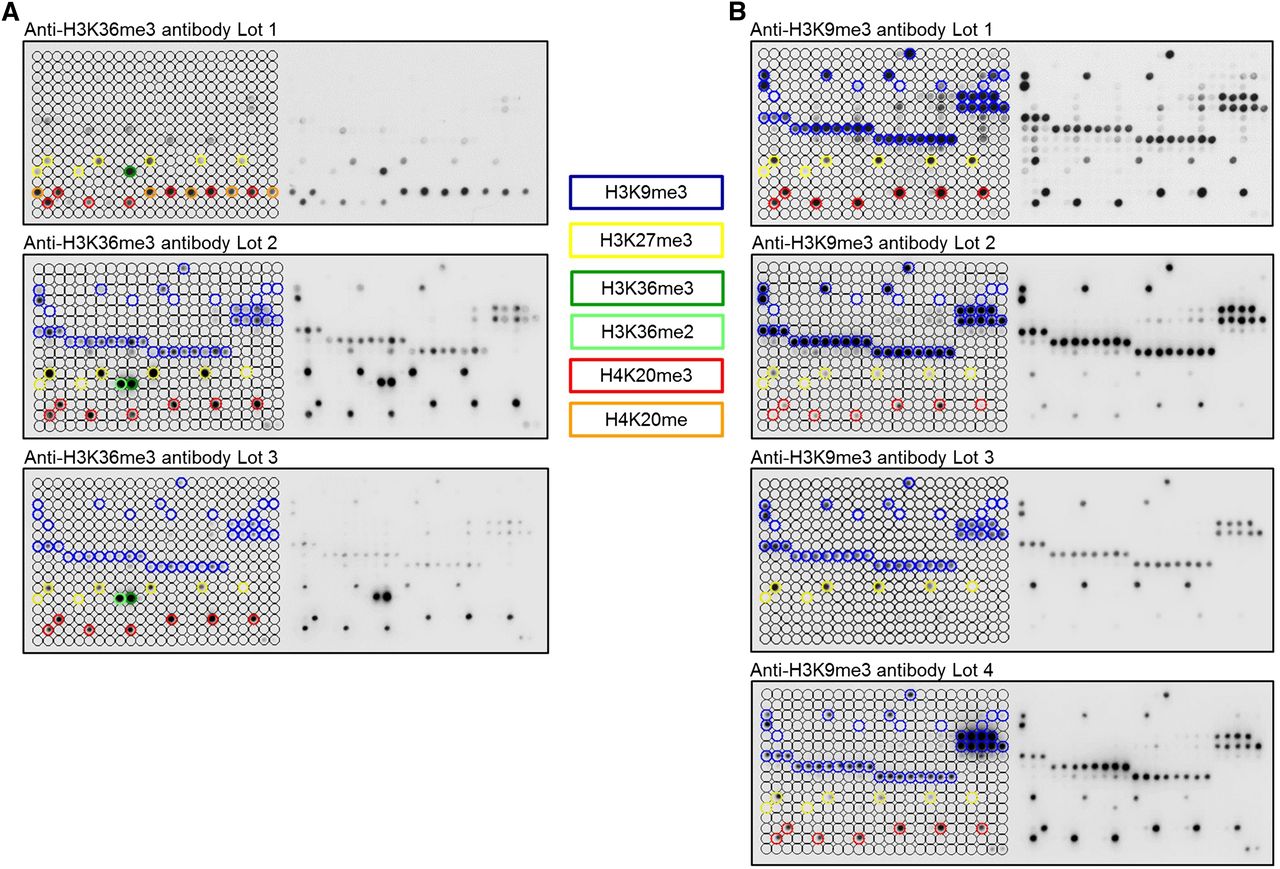 Peptide array analyses showing lot-to-lot fluctuations, cross-reactivity, and effects of proximal marks on the binding of popular histone tail antibodies. Peptide spots are annotated on the left side of the glass slide. The color-coded boxes denote the presence of the designated modifications. (A) Anti-H3K36me3 antibodies showed significant cross-reactivity to H4K20me1, H4K20me3, H3K27me3, H3K9me3, and H3K36me2. All lots of the H3K36me3 antibody had a weak binding specificity, and they showed very different properties. (B) Anti-H3K9me3 antibodies displayed cross-reactivity to H3K27me3 (Lot 3 even prefers H3K27me3 peptides) and H4K20me3 (very overt in the case of Lot 1 and Lot 4). H3K9me3 peptide spots that were not bound by these antibodies generally also contained H3S10ph or H3T11ph, indicating that this secondary mark prevents binding. For a more detailed annotation of the modifications at each spot, refer to Supplemental File S2. Among the H3K9me3 antibodies, only Lot 2 showed a binding specificity of acceptable quality. Anti-H3K36me3 (Lot 1) and anti-H3K9me3 (Lot 1) data were taken from Bock et al. (2011a) and reprocessed. Additional examples of commercial H3K36me3 antibodies with insufficient specificity are shown in Bock et al. (2011a). Examples of the fundamental differences in the specificity profiles of different antibodies directed against H3K27me3 are given in Supplemental Figure S1.