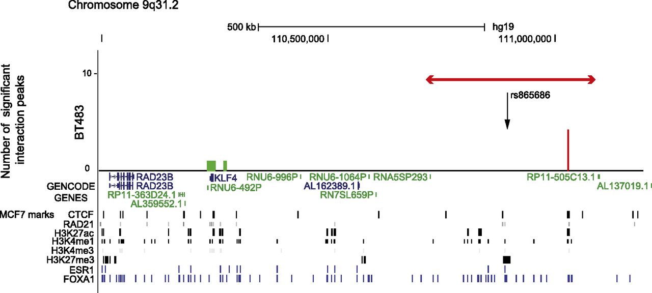 Statistically significant CHi-C interaction peaks at the 9q31.2 locus. The number of statistically significant interaction peaks mapping to each HindIII fragment (y-axis) is plotted against the genomic location of the HindIII fragment (x-axis) for a 1.2-Mb region (110.2–111.0 Mb) of chromosome 9q31.2, including the 0.3-Mb genomic region (110,759,922–111,097,304 bp) that was targeted in the sequence capture step of our CHi-C protocol. All coordinates are based on hg19. The capture region is denoted by a double-headed red arrow; the “bait end” of the interaction peaks is indicated in red; the target end is indicated in green. The significant interaction peaks are aligned with (1) GENCODE genes (v19) with protein-coding transcripts colored blue and noncoding transcripts colored green; and (2) CTCF and RAD21 binding sites, active (H3K27ac, H3K4me1, and H3K4me3) and repressive (H3K27me3) histone modification marks (in black), and ESR1 and FOXA1 binding sites (in blue) generated in the breast cancer cell line MCF7 by the ENCODE Project, Frietze et al. (2012), and Hurtado et al. (2011).