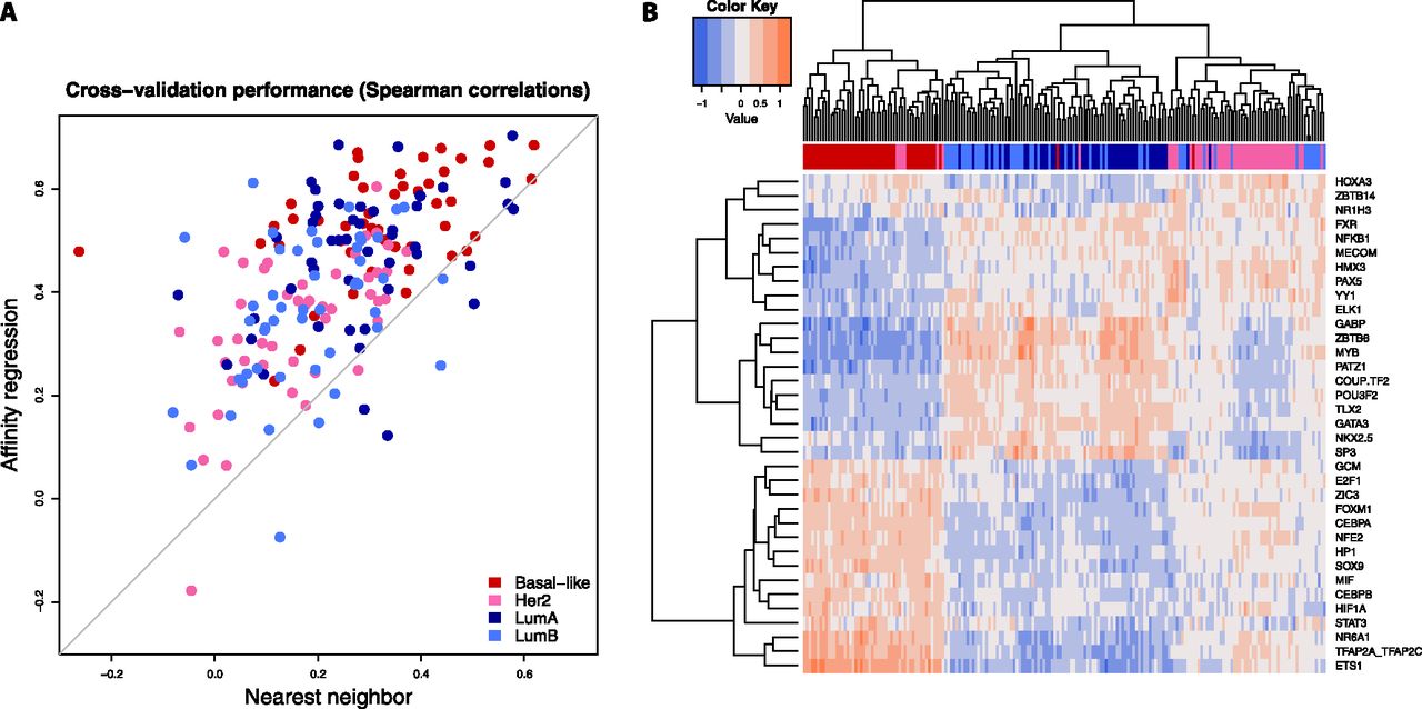 Affinity regression accurately predicts relative gene expression on held-out TCGA breast cancer samples. (A) Plot showing Spearman correlations between predicted and actual gene expression changes relative to a median reference using the affinity regression model (y-axis) and nearest neighbor (x-axis) for TCGA samples representing four breast cancer subtypes (Basal-like, HER2, LumA, LumB). (B) Unsupervised hierarchical clustering of tumors based on inferred TF activities recovers Basal-like, HER2, and Luminal (LumA and LumB) subtypes. The clustering was performed using all TFs (see Supplemental Fig. S3), but for readability, only the features with the largest standard deviation across samples are shown in the heatmap.