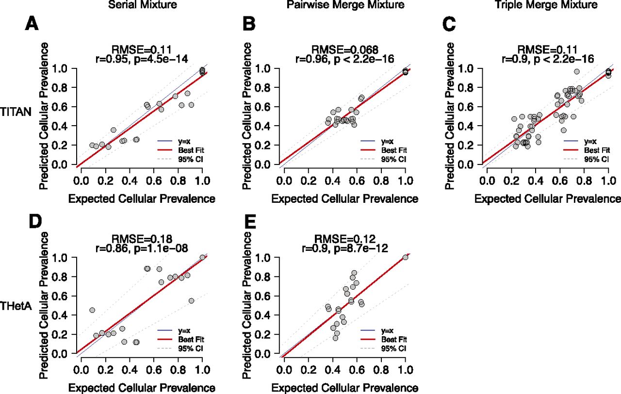 Performance of TITAN tumor cellular prevalence estimates for serial (30×) and pairwise (60×)/triplet (90×) merging simulations of intratumor samples from a HGS ovarian carcinoma. Pearson correlation coefficients (r) and root mean squared error (RMSE) were computed for TITAN (A–C) and THetA (Oesper et al. 2013) (D,E). Correlation and RMSE were computed by comparing the cellular prevalences of the predicted clusters with the prevalence of the expected clusters across the mixture samples. Each data point represents an expected clonal cluster with a unique tumor cellular prevalence. Ground truth and expected tumor cellular prevalence values were computed from the tumor contribution from each individual sample making up the simulated mixture (Supplemental Table 3B–D).