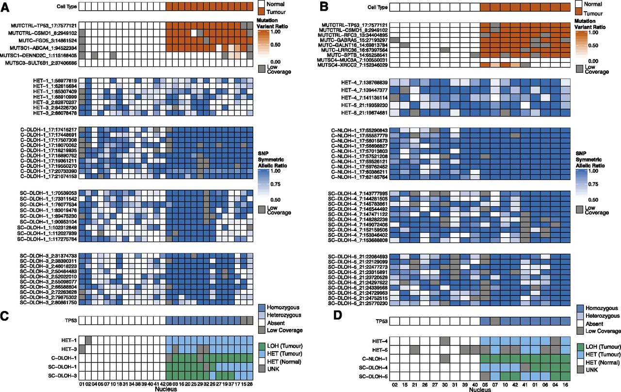 Single-cell validation of subclonal deletions in DG1136g using deep DNA sequencing of individual nuclei. (A,B) The 28 nuclei for Set1 and 18 nuclei for Set2 were designated as tumor and normal cell type using the status of mutations. The mutant allele ratio (variant reads/depth) for mutations and symmetric allele ratio (max(reference reads, variant reads)/depth) for SNP positions are shown for Set1 (A) and Set2 (B) events. Low coverage positions are shaded in gray. (C,D) The LOH status for each event for Set1 (C) and Set2 (D) were determined using the binomial test for dropout and Wilcoxon rank sum test for allelic ratios. TP53 mutation status is shown. The LOH status for each heterozygous (HET) and LOH (C-DLOH, SC-DLOH) event is shown. “Tumor” nuclei having the LOH event (green) or not having the event (blue) are shown to illustrate the original three-component mixture model (Fig. 2A). Normal nuclei are designated “Normal” (white). Unknown events (gray) were inconclusive for HET or LOH status. See Supplemental Methods for details.