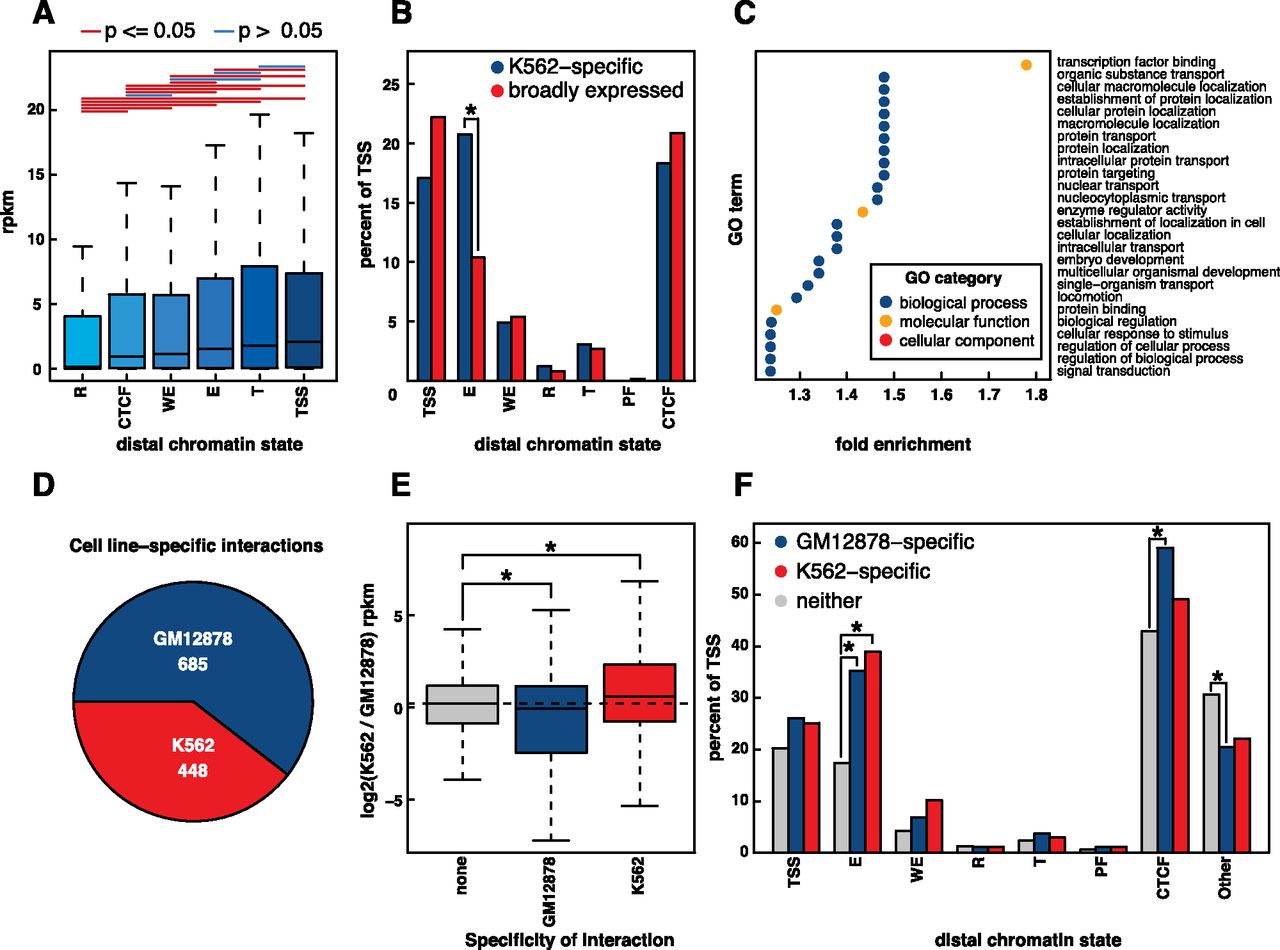 Promoter interactions. (A) Box and whisker plot depicting gene expression (RPKM) as a function of distal chromatin regions. Comparisons that exhibited significant differences (P < 0.05, Wilcoxon signed-rank test) are indicated by red lines, while those that were not significantly different (P ≥ 0.05, Wilcoxon signed-rank test) are indicated by blue lines. (B) Barplot depicting the percentage of genes whose promotors are involved in an interaction with each type of distal chromatin region. Values are shown for both genes that are K562-specific and genes that are broadly expressed. (*) Significant difference (P < 0.05, Fisher’s exact test). (C) GO terms enriched in sets of genes whose promoters interact with enhancers (P < 0.01, Fisher’s exact test with Benjamini-Hochberg correction, fold-change > 1.2). (D) Differential interactions between GM12878 and K562 (FDR = 0.05). See Supplemental Information. (E) Log2 expression changes between K562 and GM12878 for all genes, genes that overlap the ends of GM12878-specific interactions, and genes that overlap the ends of K562-specific interactions. (*) Significant difference from all genes (P < 0.01, Wilcoxon signed-rank test). (F) Percentage of TSS that interact with at least one of each distal regulatory region. (*) Significant difference from all genes (P < 0.01, Fisher’s exact test).