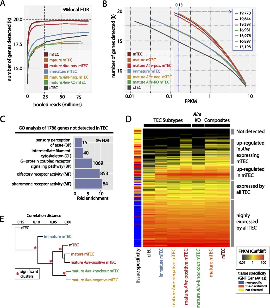 RNA-seq analysis reveals the full extent of PGE in TEC. (A) The number of genes detected in each FACS sorted TEC population at a local FDR of 5% (see Methods; Supplemental Fig. 3; Supplemental Table 2) as a function of read depth (pooled replicates) indicates that read depth was not limiting for most of the TEC populations. (B) The number of genes detected in the TEC populations at different FPKM thresholds. The left-hand start of the solid lines indicates the expression level that corresponds to a local FDR of 5% for a given TEC population (see also Supplemental Fig. 3C). The vertical blue dashed line indicates the FPKM at which genes can be reliably detected in all TEC types (numbers of genes detected at this threshold are shown in inset). (C) Selected GO categories enriched in genes not detected in any TEC population reveal a striking enrichment for odorant receptors (Supplemental Fig. 5). (CL) Cellular location; (BP) biological process; (MF) molecular function. (D) Hierarchical clustering of the expression levels of all protein-coding genes in the TEC populations reveals three distinct strata of PGE. The color key to the left of the heatmap indicates the tissue specificity of genes in the GNF GeneAtlas according to the dynamic step method (Methods; Supplemental Fig. 6). (E) Hierarchical clustering of the TEC populations by gene expression correlation distance reveals four significant clusters (red asterisks, P > 0.95).