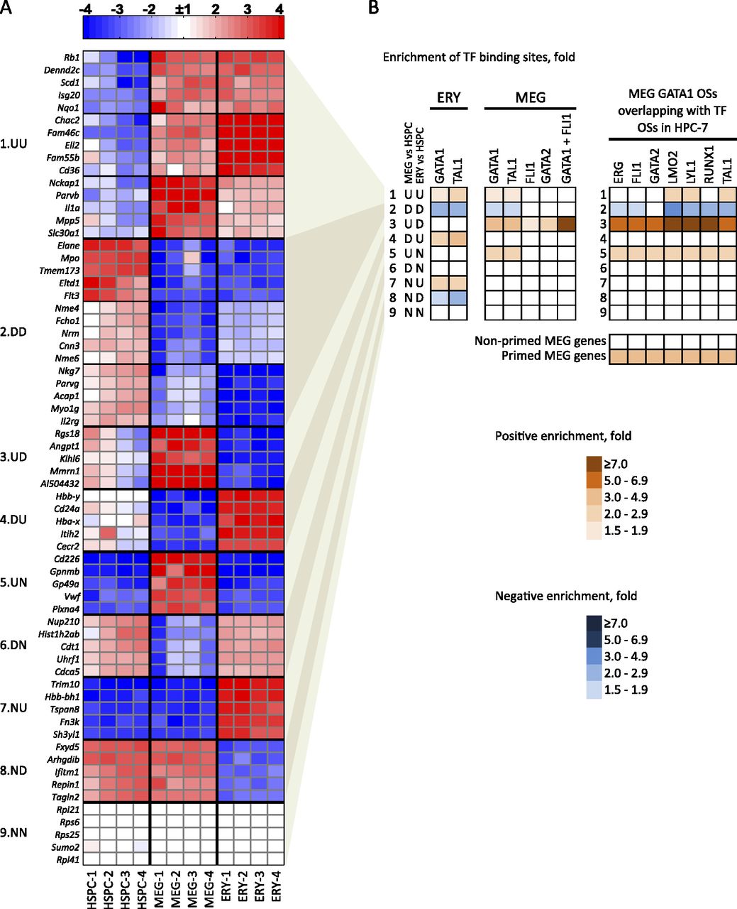 Mechanisms of transcriptional regulation correlate with patterns of erythro-megakaryocytic gene expression. (A) Heatmap of mRNA expression in HSPCs, MEG, and ERY with top changed genes clustered into nine groups according to patterns of expression relative to that of HSPCs. Data from four biological replicates are shown for each lineage. In each cluster, a nonbiased selection of top changed genes is shown: (U) up-regulated; (D) down-regulated; (N) no change. For example, cluster 3, labeled “UD,” represents genes that are up-regulated in MEG and down-regulated in ERY versus HSPCs. Total numbers of genes in each cluster, as well as gene function enrichments, are shown in Supplemental Figure 10A. (B) Over- or underrepresentation of transcription factor occupancy within ERY and MEG genes across the nine expression pattern clusters described in A. The enrichment value is a ratio of the fraction of genes in a given cluster occupied by a given transcription factor versus the fraction of occupied genes in the global expressed gene set of 7513 genes. The color-coding shows positive or negative enrichment of transcription factor binding in each gene cluster relative to the genome-wide average of binding probability (indicated by white color). All enrichments shown have P-values < 0.001 by Fisher’s exact test. The right panel shows enrichments of overlapping of MEG GATA1 OSs with indicated transcription factor OSs in HPC-7 hematopoietic progenitor cells (see Fig. 2; Wilson et al. 2010). The bottom panel shows enrichment of transcription factor binding in primed versus nonprimed MEG genes.