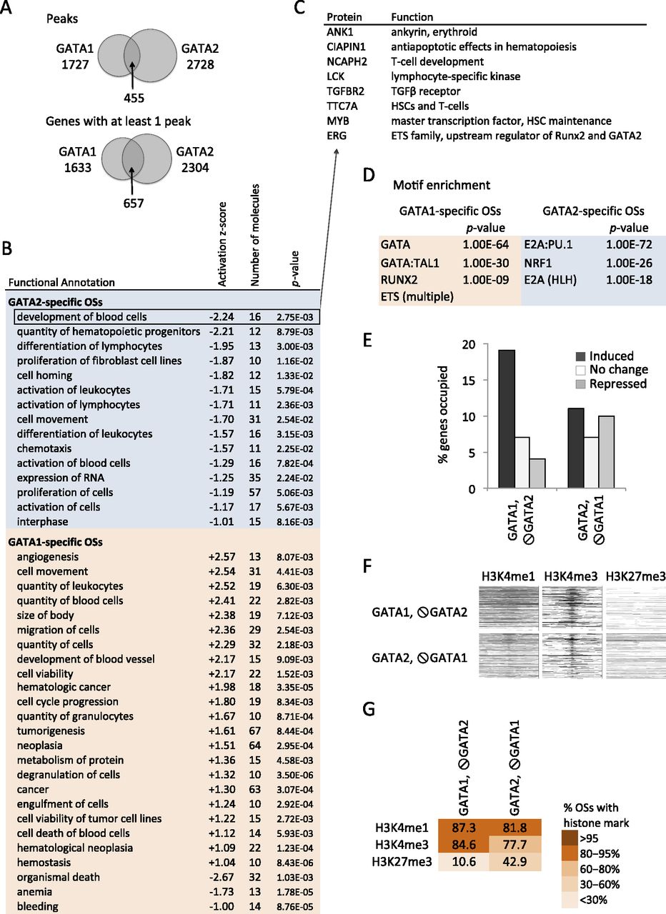 Distinct properties of GATA1 and GATA2 in late megakaryopoiesis. (A) Venn diagram showing the intersection of GATA1 and GATA2 occupancy peaks (Peaks) and bound genes (Genes) in MEG. (B) Ingenuity Pathway Analysis (IPA) showing predicted functions of genes associated with GATA1- or GATA2-specific chromatin OSs. A negative Z-score predicts mean repression of gene expression in the group, whereas a positive score predicts gene induction. Significantly enriched functional categories with ≥10 proteins and absolute Z-scores > 1, are shown. (C) Examples of GATA2-repressed genes in late megakaryopoiesis. (D) Motif enrichment in the 200-bp sequence centered on the transcription factor peaks at the GATA1- and GATA2-specific OSs, with those of the alternate GATA factor used reciprocally as background. (E) Fraction of up-regulated, unchanged, and down-regulated genes containing GATA1-selective and GATA2-selective OSs. (F) Heatmaps of H3K4me3, H3K4me1, and H3K27me3 histone modification marks centered around the transcription factor binding peaks at GATA1- and GATA2- specific OSs ordered from top to bottom by transcription factor peak significance. (G) Color-coded fractions of GATA1- and GATA2-specific transcription factor binding sites associated with H3K4me3, H3K4me1, and H3K27me3 histone methylation patterns in MEG.