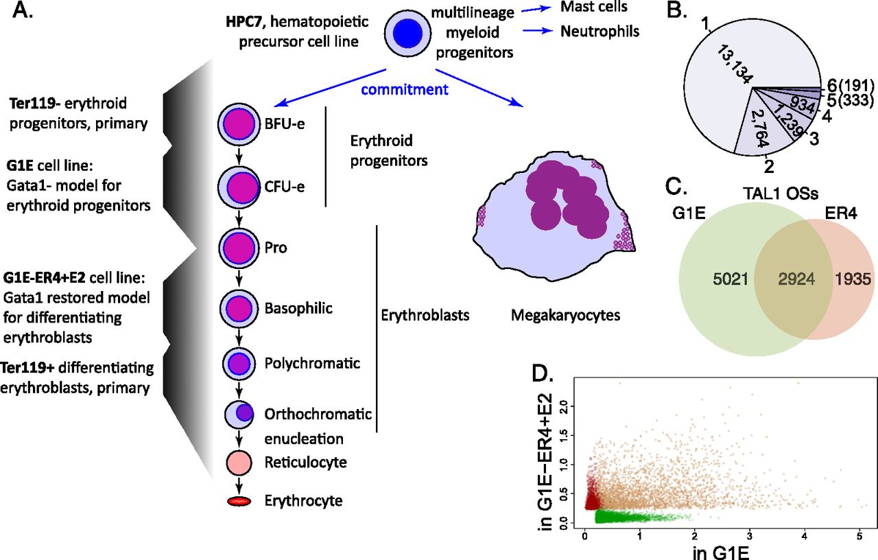 Erythropoiesis, megakaryopoiesis, and relocation of TAL1 occupancy. (A) The diagram shows differentiation from hematopoietic precursors to erythroblasts and megakaryocytes, including the corresponding cell types or lines used in this study. (B) The numbers of merged TAL1 OSs that are occupied by TAL1 in one to six of the assayed cell types or lines. (C) Venn diagram showing cell type–specific and shared TAL1 OSs in G1E and G1E-ER4 + E2 (ER4) cell lines. (D) Scatter plot showing the normalized ChIP-seq read counts of TAL1 on the TAL1 OSs in G1E versus ER4 cells. The TAL1 OSs identified only in G1E, only in ER4, or both are represented by green, red, or brown dots, respectively.