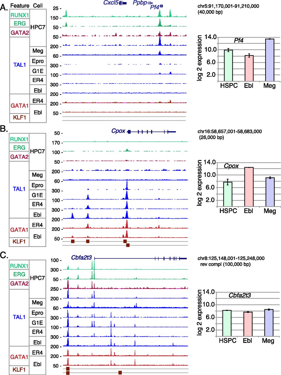 Loci illustrating shifts in patterns of TAL1 occupancy and co-occupancy by other transcription factors among the six differentiation stages. Each panel shows on the left the signal track for each indicated transcription factor binding in the designated cell type. Signal for TAL1 binding is blue; for GATA factors, red; and those for other factors, green. Peak calls for KLF1 in erythroblasts are shown from two different sources; the upper boxes are from Tallack et al. (2010), and the lower boxes are from Pilon et al. (2011). Direction of transcription for each gene is left to right. The graphs on the right show levels of expression in hematopoietic stem progenitor cells (HSPCs), which are a proxy for expression in HPC-7 cells, erythroblasts, and megakaryocytes (Pimkin et al. 2014). (A) The Pf4 gene (encoding platelet factor 4) illustrates TAL1 binding in megakaryocytes and in HPC-7, not in erythroid cells. (B) The Cpox gene (encoding coproporphyrinogen oxidase) is bound almost exclusively in erythroid cells. (C) The Cbfa2t3 gene is bound at multiple locations, which show a diversity of patterns across differentiation.