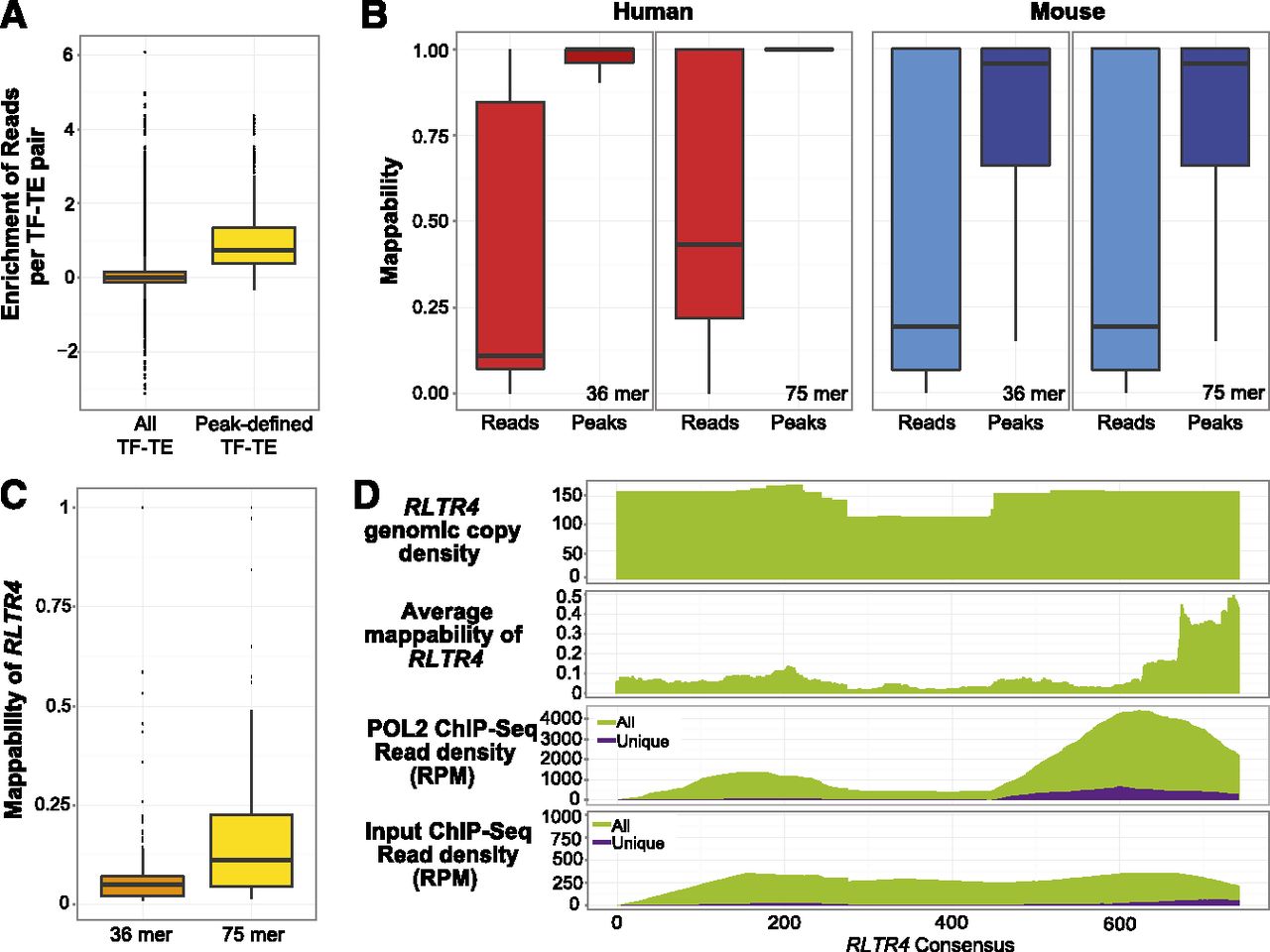 Including nonuniquely mapped reads (multireads) captured additional binding events on TEs. (A) Comparison between the enrichment of reads (see Methods) for all TF–TE pairs and TF–TE pairs that were enriched for interactions defined by peaks (see Methods). (B) Distribution of mappability scores (for 36-mer and 75-mer, respectively) of TE subfamilies. (Peaks) TE subfamilies enriched for TF binding peaks; (reads) TE subfamilies enriched for ChIP-seq reads (including both unique and nonunique reads). We calculated the mappability score (level of sequence uniqueness) for each genomic copy of a particular TE subfamily using mappability tracks downloaded from the UCSC Genome Browser, where 1.0 = 100% mapped uniquely, and 0 = 0% mapped uniquely. (C) Distribution of the mappability scores for the genomic copies of the RLTR4 subfamily in mouse by using 36-mer and 75-mer sequence reads. (D) Comparison of the ChIP-seq signal using unique and all reads in RLTR4. The first panel shows genomic coverage of RLTR4 copies on the RLTR4 consensus sequence. The second panel shows the average mappability (75-mer) score (mappability file was downloaded from the UCSC Genome Browser). The third panel shows the accumulation of POL2 ChIP-seq reads over RLTR4 consensus, with purple representing unique reads, and green representing both unique and non-unique reads. The fourth panel shows the accumulation of ChIP input reads over the RLTR4 consensus sequence.
