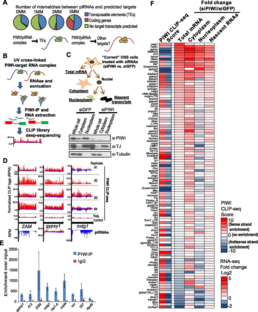 Transcriptome profiling and CLIP-seq confirm that transposable elements (TEs) are the main direct targets of PIWI-mediated regulation. (A) Bioinformatic prediction of PIWI/piRNA targets in OSS cells based on complementarity to piRNAs (Lau et al. 2009). With more mismatches (#MM), more coding genes are predicted to pair with piRNAs. These data suggest possible PIWI targets beyond TEs. (B) Scheme for PIWI CLIP-seq approach to identify PIWI associated transcripts. (C) Scheme for cellular fractionation and mRNA and nascent RNA isolation from OSS cells treated with siRNAs. Western blots confirm successful PIWI knockdown and separation of cytoplasmic from nucleoplasmic fractions. TJ is a transcription factor marking nuclear fractions, while tubulin is mainly cytoplasmic. (D) Different PIWI CLIP-seq profiles and corresponding piRNAs profiles of TEs with top PIWI CLIP scores. (Red) Plus strand reads; (blue) minus strand reads. Normalized CLIP-seq reads were deemed significant from our CLIP-seq processing algorithm. (RPM) Reads per million. (E) RNP-IP (RIP) assays validate TE transcript association with PIWI. Error bars correspond to standard deviation from five biological replicates. (F) Heat map showing TE transcript level changes in different compartments after PIWI knockdown in comparison to PIWI CLIP-seq scores. PIWI CLIP-seq scores with only red colors reflect primarily sense-strand patterns (Fig. 1D), only blue colors reflect primarily antisense-strand patterns (Supplemental Fig. S2F), and both strands when both red and blue colors are shown.