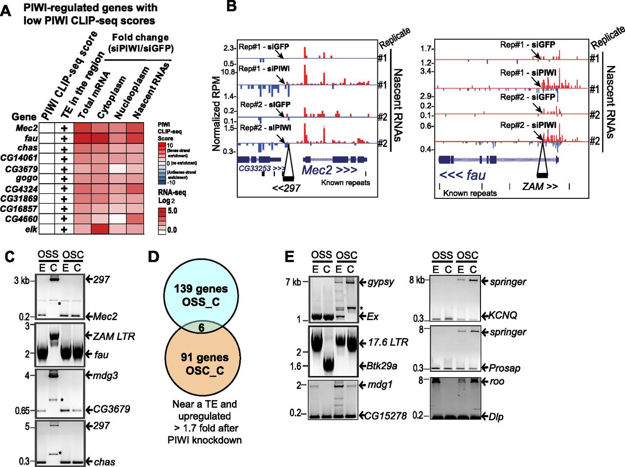 De novo TE insertions near genes impart PIWI-mediated gene silencing. (A) Heat map of top PIWI-regulated genes identified in OSS cells with low CLIP scores and which have a de novo TE insertion nearby. (B) Nascent transcript profiles for two loci that contain de novo TE insertions and are strongly regulated by PIWI silencing. Arrows point to the changing levels of reads for genes and the independent nascent transcripts arising from the TE insertion. (C) Genomic PCR confirms these persistent TE insertions specifically in the OSS_C line. “E” and “C” represent early and current passage of cells (see Fig. 3A). These are persistent TE insertions because no reference genome amplicon (the lowest band) is detected. Asterisks mark side-product amplicons. (D) Venn diagram showing distinct group of PIWI-regulated genes between OSCs and OSS cells. (E) Genomic PCR shows TE insertions specific to the OSC cells. (Left panel) Genes noted in Sienski et al. (2012); (right panel) additional insertions near genes we validated in OSC cell genomes. These are heterogeneous TE insertions because a reference genome amplicon is detected in addition to the TE amplicon. Asterisks mark side-product amplicons.