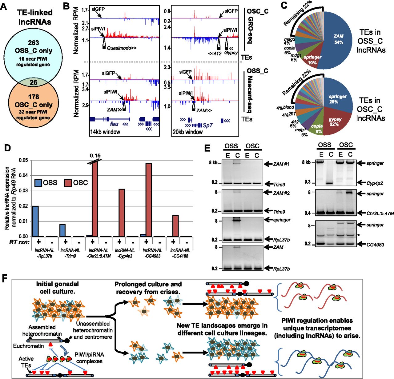 TE landscape differences correlate with lncRNA diversity. (A) Venn diagram of unambiguous lncRNAs that are mostly distinct populations between OSCs and OSS cells. The overlap represents lncRNAs that overlap by at least 1 kb in genomic coordinates from the D. melanogaster Release 5/dm3 genome. (B) Representative loci where both OSC and OSS cell genomes contain TE insertions, but the differences in TE composition are linked to differences in lncRNA configurations. (C) Composition of the major TE classes falling within lncRNA loci. (D) Quantitative RT-PCR of lncRNA expression, normalized to Rp49 levels, for loci where TE insertions are present in just one follicle cell line (lncRNA-NL-Trim9 and -NL-RpL37b in OSS cells; -NL-Chr2L:5.47M, -NL-Cyp4p2, -NL-CG4983, and -NL-CG4168 in OSCs). (E) Genomic PCR confirmation of de novo TE insertions that are either only in OSCs or only in OSS cells. Asterisk marks a nonspecific amplicon, and sequence-specific obstacles in primer design prevented genomic PCR validation of TE insertions in the CG4168 locus. (F) Model for TE dynamics in follicle cell cultures that result in distinct TE landscapes and unique transcriptome profiles, including the production of novel lncRNAs.