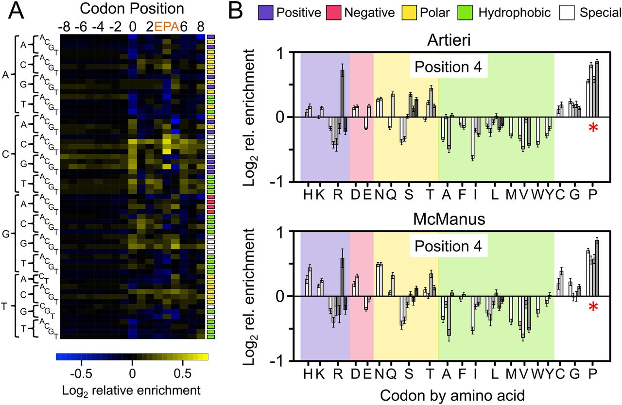 The corrected Ribo coverage reveals a strong enrichment of proline codons. (A) Heatmap of the mean-scaled log2 enrichment of codon positions −8 to 8 in the Artieri data (the McManus data are similar) (Supplemental Fig. S9). All 61 sense codons are shown in alphabetical order indicated by their sequences on the left. Enriched codons are indicated by an increasing intensity of yellow color, while depleted codons are blue. Colored boxes to the right of each row indicate the biochemical category to which the codon belongs (color key is at the top of panel B). Codons associated with the E, P, and A active sites of the ribosome (positions 3, 4, and 5, respectively) are indicated. (B) Bar plots indicating the log2 enrichment values at position 4 of both the Artieri and McManus data sets. Codons are organized by amino acid using single-letter designations below the panel and grouped by biochemical type as indicated at the top of the panel. Individual codons for each amino acid are in alphabetical order. The 95% confidence intervals around the scaled enrichment values are indicated at the top of each bar. The asterisks indicate that proline (P) codons are more enriched than any other amino acid (Kruskal-Wallis rank sum test, P < 10−15).