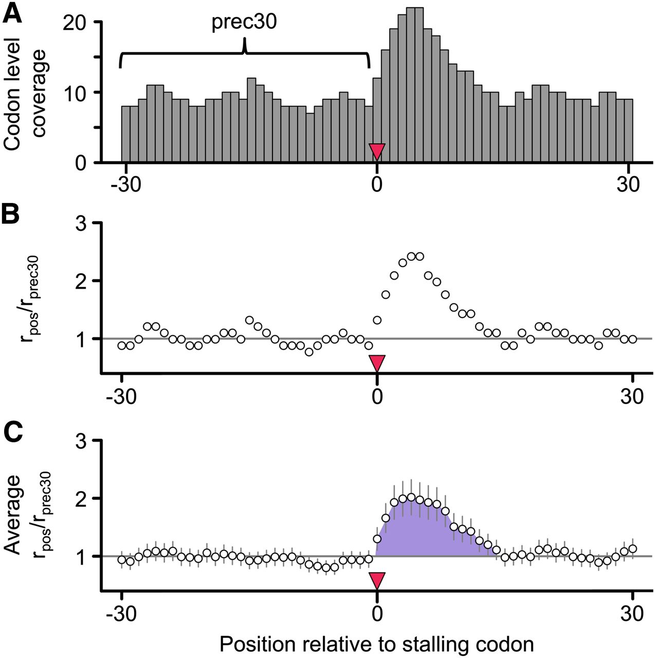 The rpos/rprec30 method of Charneski and Hurst. (A) As a measure of the stalling effect of a codon (or group of codons beginning) at position 0, the occupancy of all codon positions (rpos) from 30 codons upstream (position −30) to 30 codons downstream (position 30) of the putative stalling codon was divided by the mean occupancy of upstream codons −30 to −1 (rprec30, indicated by the bracket). (B) This produced a normalized pausing value (rpos/rprec30), where a value of one represents the average rate of translation. (C) After averaging the rpos/rprec30 values among all similar groups of codons, the AUC (indicated by the shaded purple area) of the mean-normalized occupancy values from position 0 until the position where mean occupancy returned to the average was used as a measure of the stalling effect (if positive).
