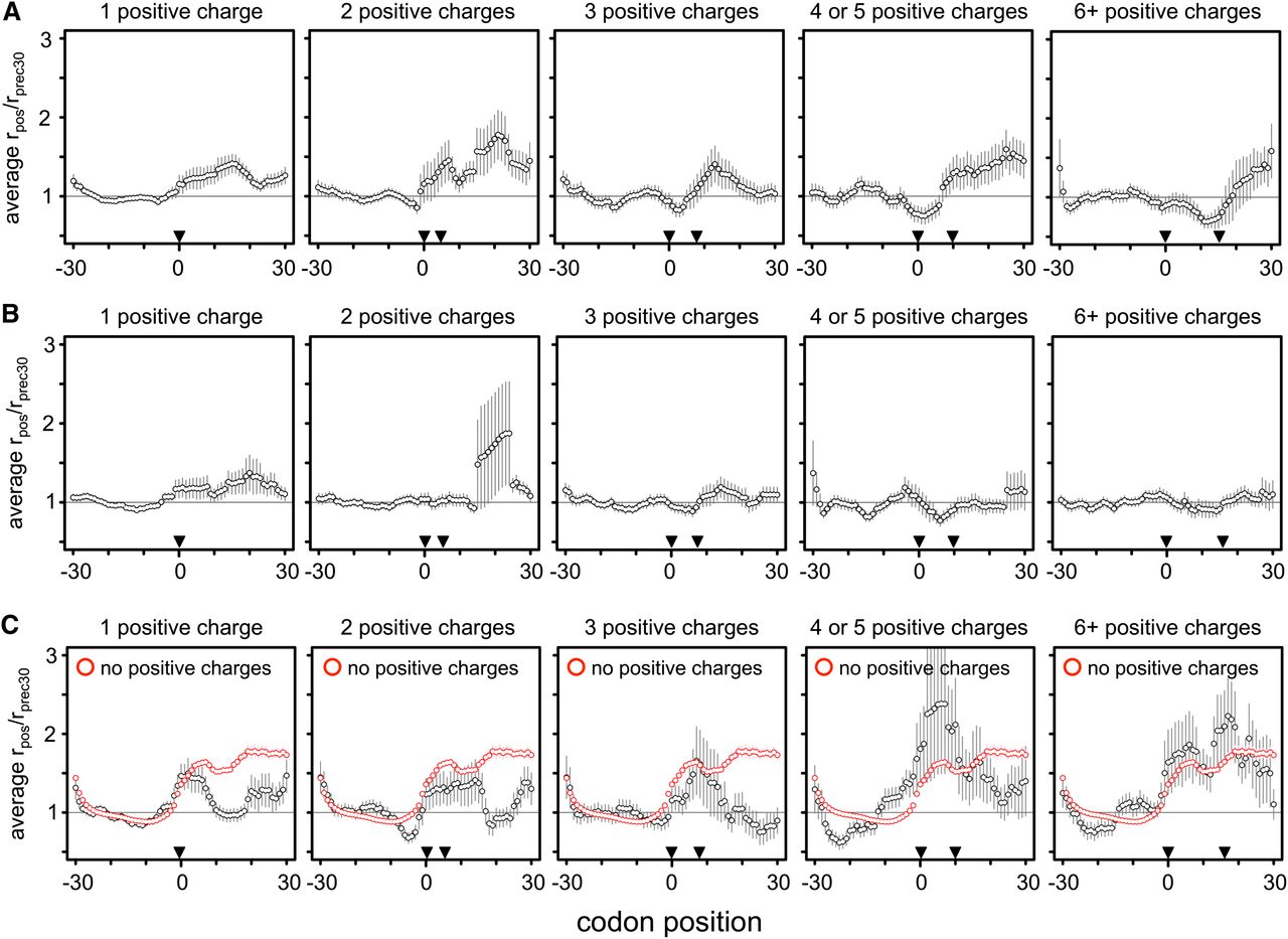 No evidence of stalling at positive amino acids. We recalculated Charneski and Hurst’s (2013) Figure 5 using either the Artieri (A) or the McManus (B) data. Following the published approach, clusters of increasing numbers of positive amino acid encoding codons were identified within the range bounded by pairs of inverted triangles. The horizontal gray line indicates the average rate of translation. Error bars, ±SEM. No additive effect is observed in either high-coverage data set, in contrast to the Ingolia data (Supplemental Fig. S27); the AUCs for one, two, three, four or five, and six or more positive charge clusters were 7.89, 12.83, −0.71, −1.36, and −2.75 for the Artieri data, and 6.46, 0.08, −0.59, 0.04, and 0.09 for the McManus data, respectively. (C) The data from Charneski and Hurst’s (2013) Figure 5 (black) compared to the mean rpos/rprec30 generated from 100 random samplings of 61-codon windows devoid of any positive amino acid encoding codons (red). The average stalling pattern of windows lacking any positive charges is stronger than that observed in any of the clusters (Kruskal-Wallis rank sum test of distributions’ AUC values, P < 10−15 for all clusters except for six or more positive charges, where P = 0.02 after Bonferroni correction for multiple tests). Therefore the observed stalling effect of positive amino acids is not greater than what would be expected by chance within the Ingolia data.