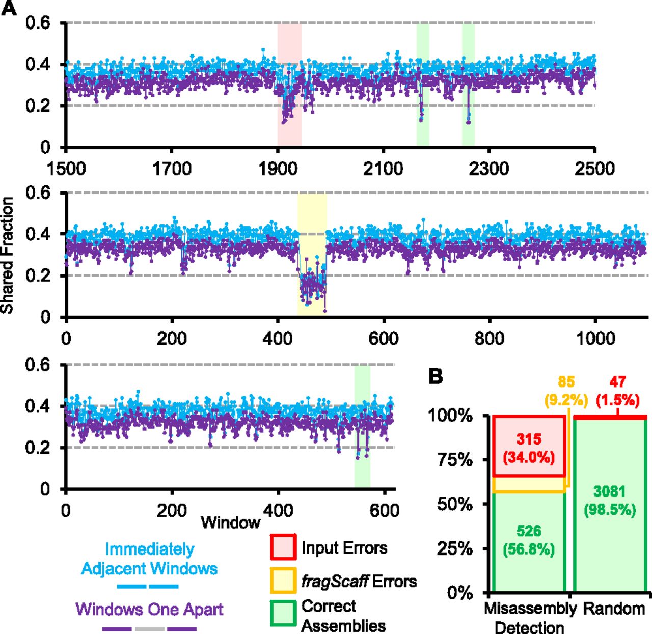 Misassembly detection using CPT-seq. (A) Three regions of assembled scaffolds representing various misassembly detections are shown. For each region, the set of CPT-seq indexed pools that cover each 5-kbp window (x-axis) was determined. The shared fraction of indexed pools between immediately adjacent windows (blue) and for windows one apart (purple) is plotted. Subregions for which both shared fraction values were in the bottom fifth percentile overall were called as potential misassemblies. False positive misassembly calls (i.e., no misassembly is actually present) overwhelmingly consisted of an isolated window (green shading), whereas multiple consecutive windows with low shared fraction values corresponded to misassemblies by fragScaff (yellow shading) or in the initial input assembly (red shading). (B) Breakdown of regions called as potentially misassembled by this approach (left) versus a randomly selected set of windows for comparison (right).