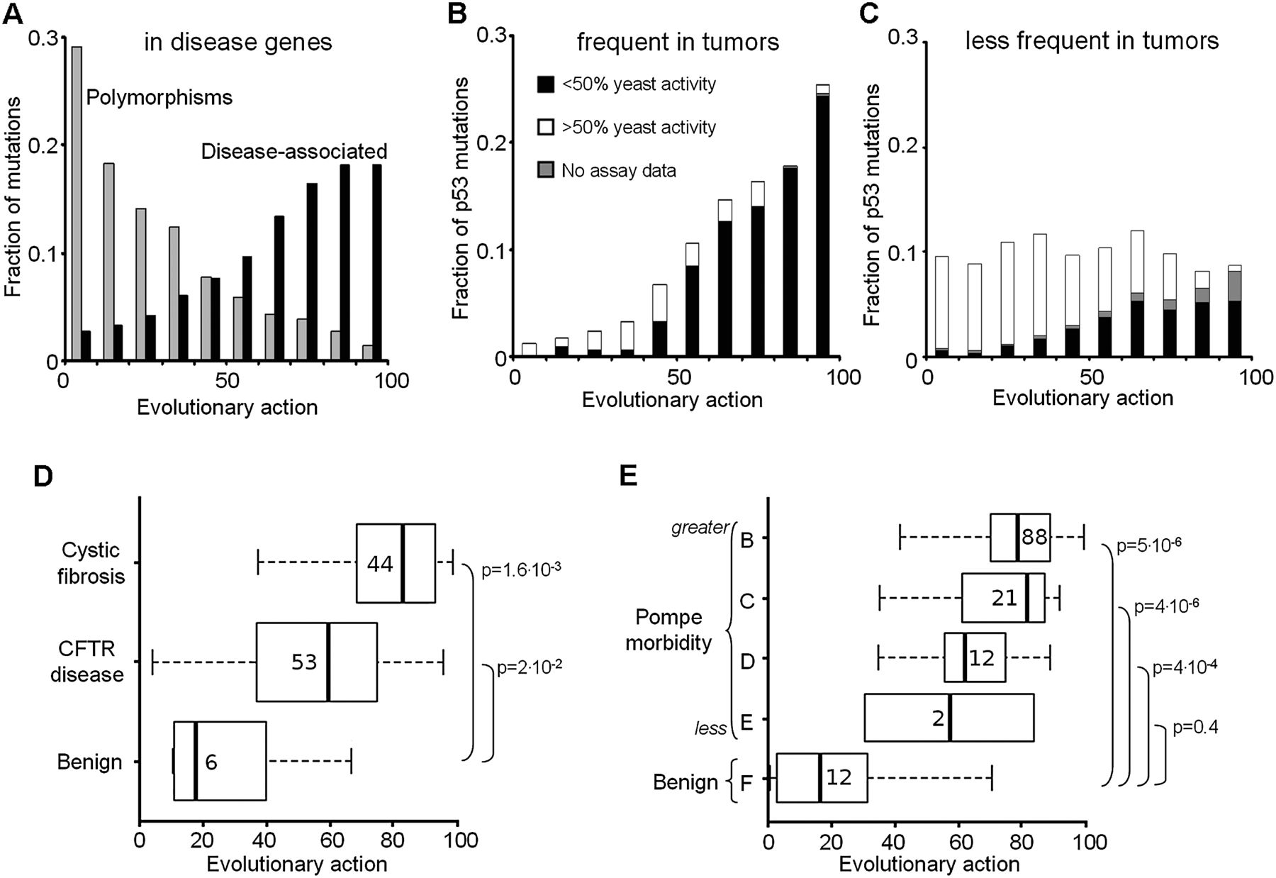 Mutational action correlates with morbidity. (A) The action distributions of coding polymorphisms from 218 genes for the 8553 cases that are disease-associated (in black) compared to the 794 that are benign (in gray). Each of these genes, obtained from the UniProt database, is linked to at least one disease. (B) The action distribution of 343 somatic TP53 mutations found frequently in tumor samples (at least ten times in 26,597 cases tallied in the IARC database), compared to (C) the remaining 1026 sporadic TP53 mutations. The fraction with less (more) than 50% of the wild-type transactivation activity in yeast assays is black (white), and those for which these data are unknown is gray. (D) The action distribution of 103 mutations in the CFTR gene binned by the severity of clinical presentation: full-blown cystic fibrosis (top), CFTR-related disorders (middle), and no symptoms (bottom) (Dorfman et al. 2010). Vertical bars indicate median action; numbers refer to the total mutations in each group; box sizes match the quartiles of the distributions, and the error bars indicate the spread of variation. (E) The action distribution of 135 Pompe disease mutations in the GAA gene binned into decreasing severity classes from Class B, the most severe, to Class F, which contains the asymptomatic patients.