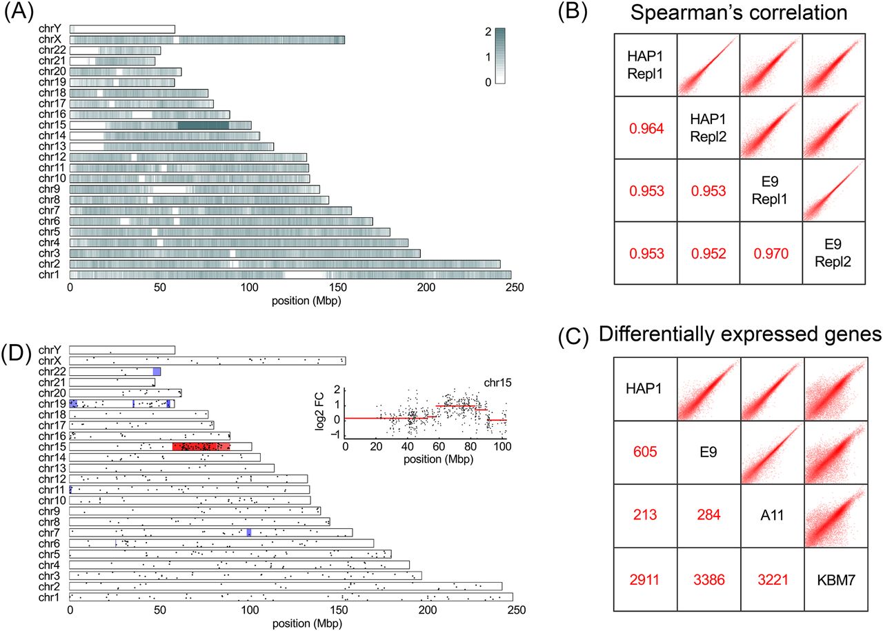Genomic and transcriptomic changes in eHAP cells are largely confined to Chromosome 15. (A) Whole-genome sequencing was performed on parental HAP1 cells and the A11 and E9 eHAP clones. In this panel, relative coverage between HAP1 and E9 data reveals a copy number loss restricted to the edited Chr 15 fragment. Large white regions correspond to unassembled pieces of the human genome. (B) Two biological replicates of HAP1 cells and two technical replicates of the E9 clone were subjected to RNA sequencing. Spearman’s correlation between the samples shows that overall expression is consistent between the parental line and the edited clones. (C) Two replicates of each cell line were compared pairwise. The number of highly expressed (FPKM > 5) and twofold differentially expressed genes are indicated. (D) Expression ratios between HAP1 and E9 cells were subjected to segmentation analysis. Red/blue bands show segments for which the expression level is consistently higher/lower in the parental cell line. (Inset) Details of the segmentation.