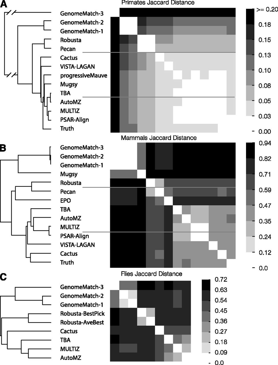 The Jaccard distance (1 − Jaccard similarity coefficient) matrix and accompanying hierarchical clustering (UPGMA) of submissions for each of the three test sets. (A) Primate Jaccard distance; (B) mammal Jaccard distance; (C) fly Jaccard distance. Higher values indicate that the sets of aligned pairs of two submissions are more dissimilar, and lower values indicate similarity.