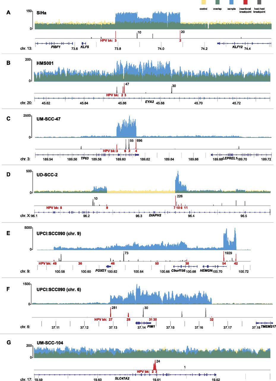Focal CNVs and breakpoints adjacent to HPV insertions. Histograms showing the depth of WGS coverage (y-axis) of well-aligned (top; yellow, blue, and green) and breakpoint sequence reads (bottom; red and gray), mapped to the reference human genome (hg19) at indicated chromosomal loci (x-axis, gene schematics, coordinates in megabases). (Top) Focal CNVs and (bottom) HPV insertional (red) or host–host (gray) breakpoints are shown for cancer samples (A) SiHa; (B) HMS001; (C) UM-SCC-47; (D) UD-SCC2; (E) UPCI:SCC090, chromosome 9; (F) UPCI:SCC090, chromosome 6; and (G) UM-SCC-104. (Top, y-axis labels) The depth of WGS coverage is shown for cancer samples (blue); normal control (yellow); overlapping, shared coverage regions (green). (Bottom) Maximal breakpoint read counts (black) and breakpoint ID numbers (HPV bk, red).