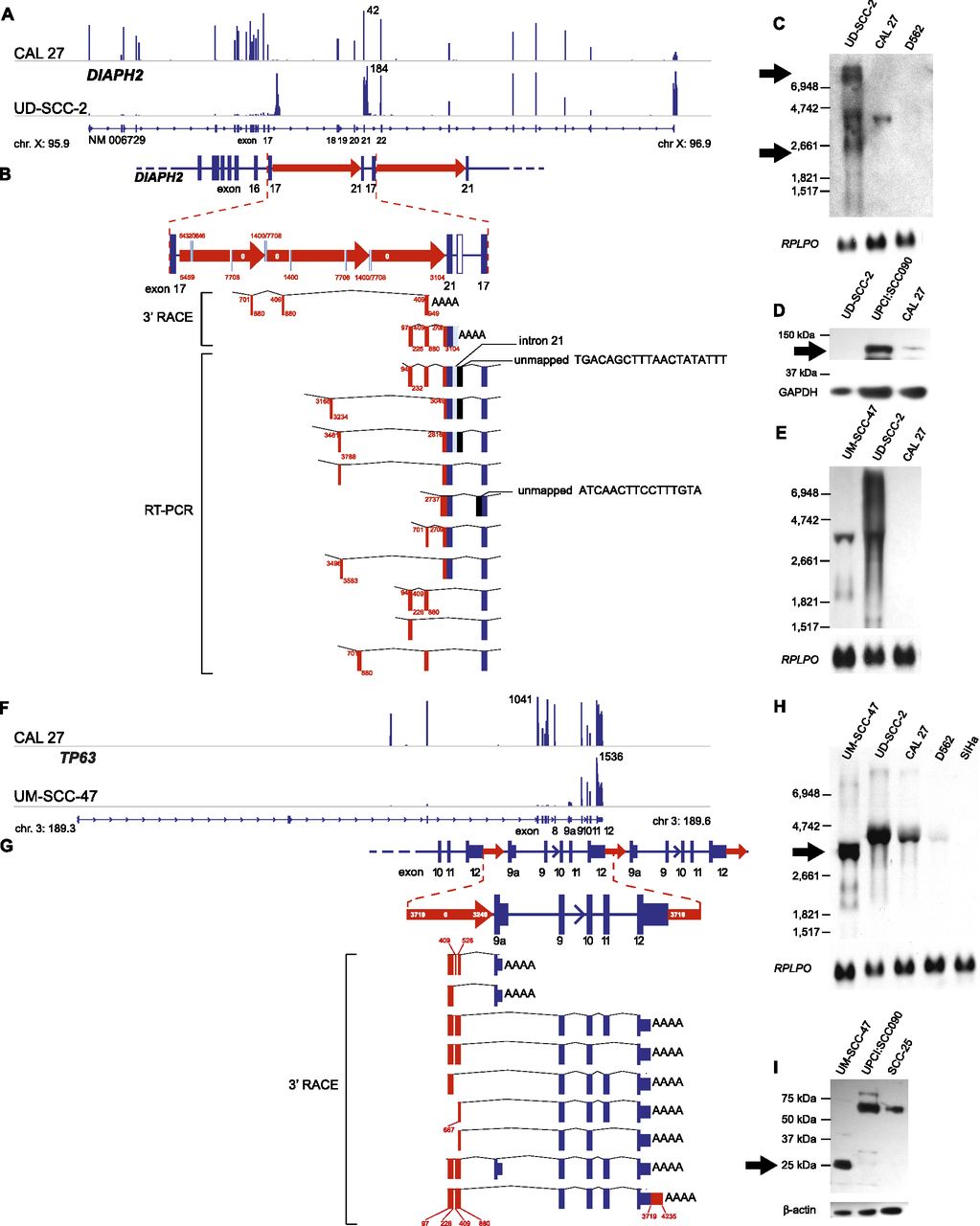 Focal HPV-associated genomic instability disrupts gene expression by diverse mechanisms. Disruption of DIAPH2 in UD-SCC-2 cells (A–E) and of TP63 in UM-SCC-47 cells (F–I) by HPV-associated genomic variation. (A) Mapped RNA-seq read histograms show 5′ expression of DIAPH2 transcript (RefSeq NM006729) in control CAL 27 (top) but not in UD-SCC-2 cells (bottom). Maximal read counts, chromosomal coordinates, and exon numbers are indicated. Truncated 3′ transcripts are overexpressed by fourfold in UD-SCC-2 cells. (B) Resolved linear structure of DIAPH2 locus after HPV integration, displaying (top and inset, middle; red arrows) direction of HPV integrants, not drawn to scale; (red and white numbers) HPV coordinates. (Bottom) Mapped viral–host fusion transcripts identified by 3′ RACE and RT-PCR. (C) Northern blot probed against DIAPH2 3′ cDNA demonstrates aberrant transcripts (arrows) in comparison to CAL 27 and UPCI:SCC090 controls. (D) Western blot showing that the protein translated from DIAPH2, i.e., diaphanous-related formin 2, is markedly reduced compared with control (top); GAPDH loading control (bottom). (E) Northern blot probed against HPV16 E7 demonstrating fusion transcripts in UD-SCC-2 and UM-SCC-47. (F) Histograms of mapped RNA-seq reads show expression of the 5′ end of TP63 in control CAL 27 but not in UM-SCC-47 cells. (G) Resolved linear structure of TP63 locus after HPV integration (top), not drawn to scale. Viral–host fusion transcripts detected by 3′ RACE (bottom) demonstrate HPV-associated gene disruption. (H) Northern blot probed against the 3′ end of TP63, showing truncated transcripts in UM-SCC-47 cells. (I) Western blot showing aberrant expression of 25-kDa p63 carboxy-terminal protein in UM-SCC-47 in comparison to 67-kDa conventional protein in UPCI:SCC090 and SCC-25 cells; (bottom) beta-actin loading control. See also Supplemental Figures 10 and 11.
