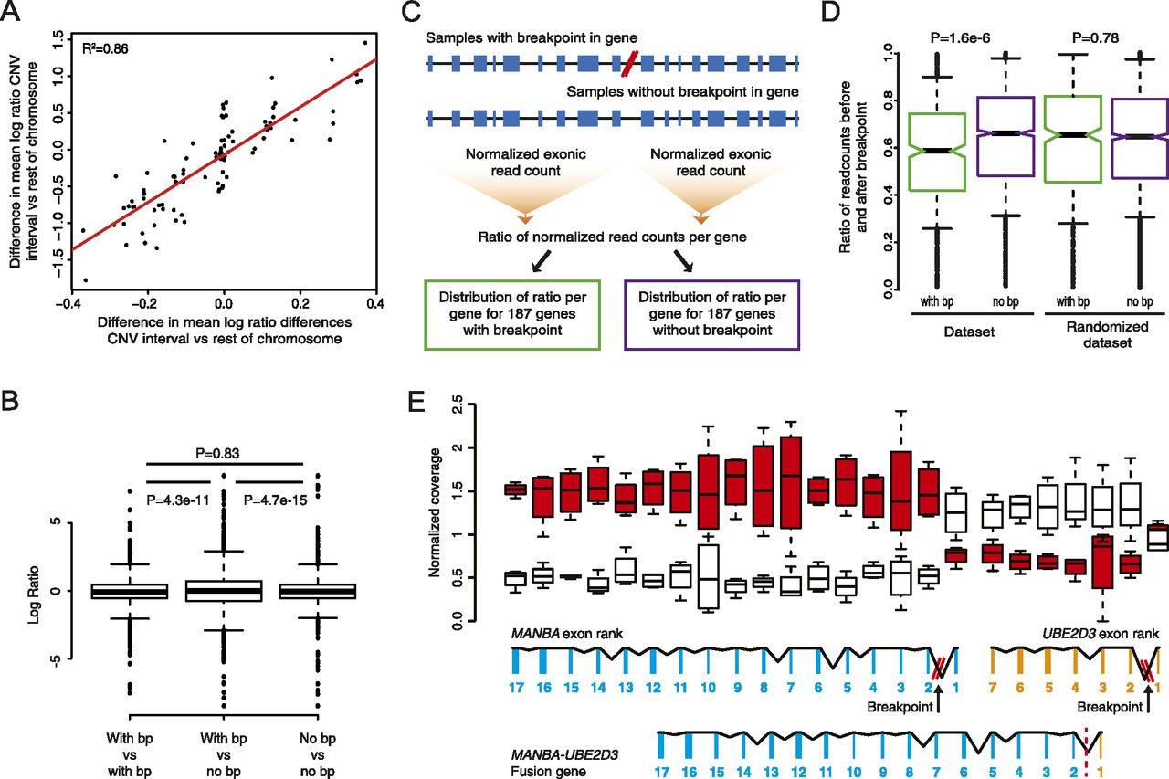 Intra-tumor differences in gene expression resulting from genomic rearrangements in patient 1. (A) Pairwise comparison of copy number changes and gene expression changes. (B) Boxplot showing log ratios derived from pairwise comparisons of patient 1 samples, categorized in three bins: (1) Both samples have a breakpoint, (2) one sample has the breakpoint and the other does not have the breakpoint, (3) both samples do not have a breakpoint. Statistical testing of differences in variance was performed using Levene’s test. (C) Schematic representation of a method used to detect expression differences of exons before and after a breakpoint in a gene. Per gene, the ratio of the normalized exonic read count before and after the breakpoint was determined for each of the samples from patient 1. Ratios were separated in two bins: one containing ratios derived from genes with a breakpoint and one containing ratios derived from genes without a breakpoint. (D) Boxplot of the distribution of ratios of the normalized exonic read count before and after a breakpoint for genes that contain a breakpoint (with bp) and genes that do not contain a breakpoint (no bp). The analysis was repeated by randomly assigning breakpoints to samples (randomized data set). Statistical testing was performed using a Mann-Whitney U-test. (E) Changes in gene expression for the exons of the MANBA and UBE2D3 gene exons in patient 1. In the presence of the deletion breakpoint a MANBA–UBE2D3 fusion gene is formed. (Red) Breakpoint present; (white) no breakpoint present.