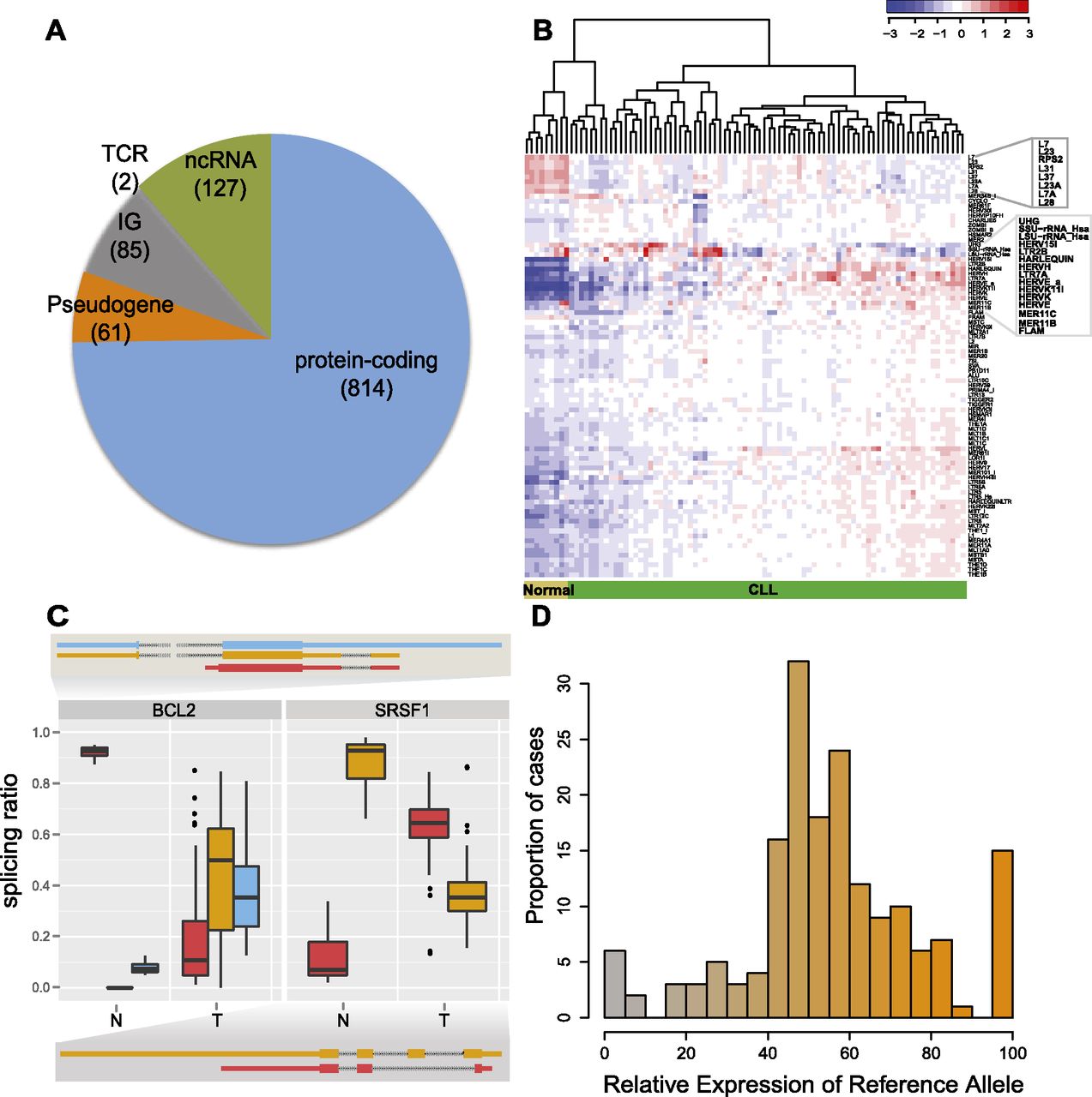 CLL transcriptional landscape. (A) Distribution of differentially expressed genes between tumor and normal samples according to their coding potential. (B) Normalized expression of transposable elements (TEs). Blue indicates low expression and red high expression, with some of the TEs differentially expressed highlighted. (C) Genes with condition-specific splicing ratios. Two of the genes with the most significant differences in the relative abundance of alternatively spliced isoforms between tumor and normal samples are shown. The boxplots correspond to the distribution of the relative abundances for each transcript (represented with a specific color) in the normal (left, N) and tumor (right, T) populations. The exonic structure of each transcript is represented using the same color scheme. (D) Allele-specific expression of somatic mutations. The relative expression of the reference allele, as derived from RNA-seq reads, was binned, and the number of cases in each bin plotted. The color gradient reflects the relative expression of the two alleles (the value that labels the bin in the x-axis).