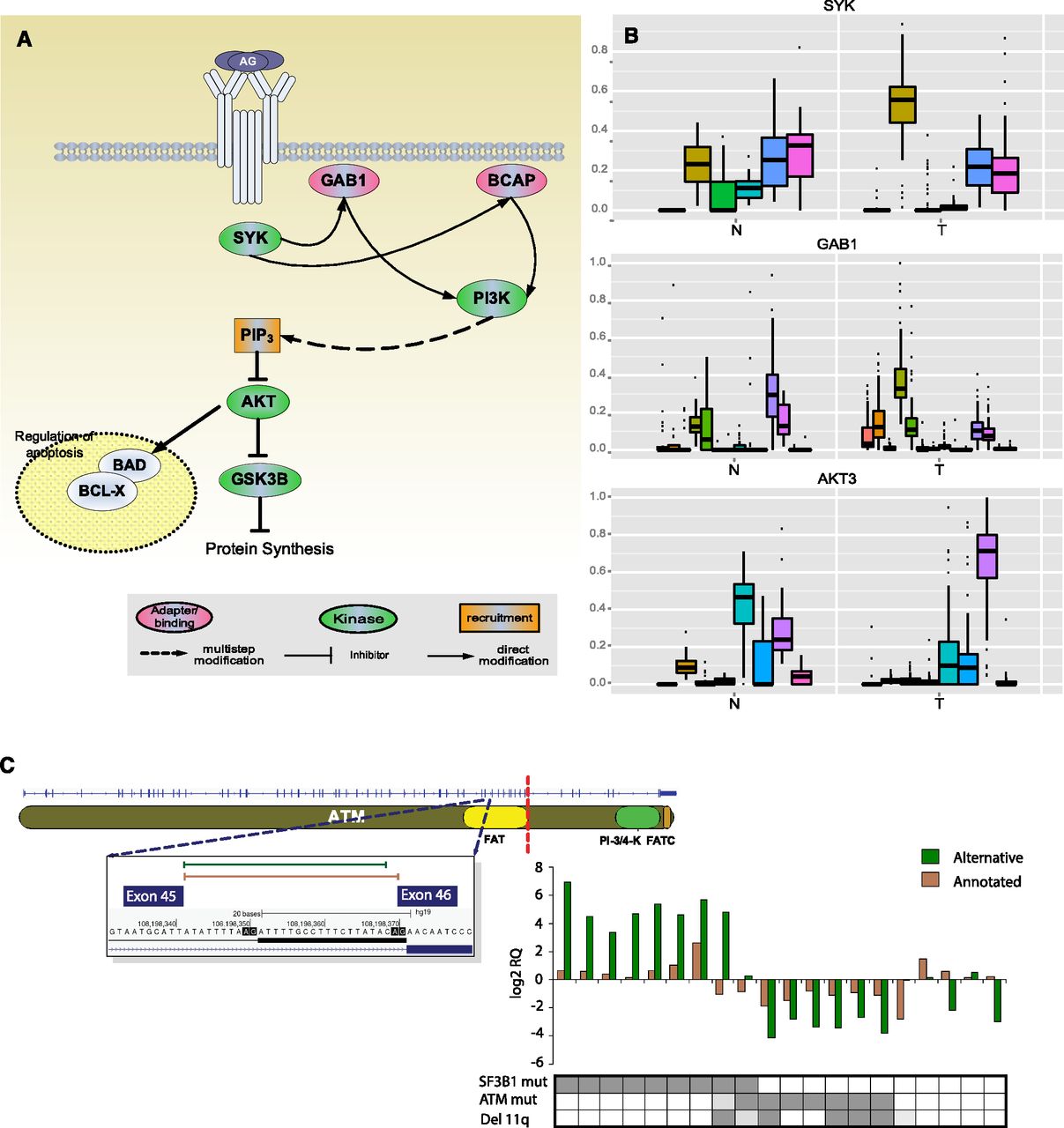 Splicing changes in the BCR pathway between normal (N) and tumor (T) samples. (A) Partial view of the BCR signaling pathway with representation of genes with significant changes in alternative splicing. (B) Distribution of alternative splicing ratios between tumor and normal samples for three example genes in the BCR pathway highlighted in A. (C) ATM splicing in SF3B1-mutated samples. (Top left) Location of CLL-specific novel splice junction in the ATM gene. The novel 3′ splice site extends 20 bp upstream into the intron. Red dashed line indicates the truncation of the C-terminal end of ATM caused by the frame shift introduced by the novel splice site. (Bottom right) Expression levels of the putative and annotated junctions analyzed by qPCR. The log2 scale of the relative gene expression is represented for cases with SF3B1 mutation (dark gray), cases with ATM mutation and/or 11q deletion (dark gray), and cases without these genetic alterations. Light gray indicates unknown status.
