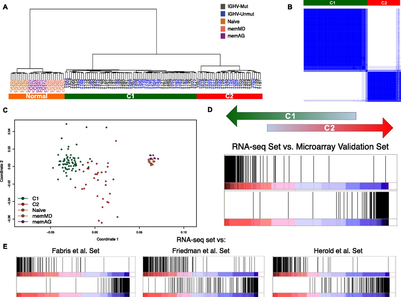Major transcriptional CLL subgroups. (A) Clustering of CLL and normal samples. Dendrogram obtained by hierarchical clustering of CLL and normal samples. (B) Consensus cluster. The matrix shows a clear and robust separation between CLL samples in C1 and C2. Dark blue regions indicate cluster partitions for samples that always cluster together (high consensus) and white indicate partitions with low consensus. (C) Multidimensional scaling of CLL and normal samples according to gene expression. (D) Enrichment score plot by GSEA comparing the RNA-seq based clustering with the clustering of an independent set of 124 samples, profiled with expression arrays. The plot compares the ranking correlation of the list of genes from the two clustering solutions. The vertical dark lines indicate where the genes in one list appear in the other ranked list of genes. An accumulation at the extremes indicates an agreement between the two lists. (E) Enrichment score plot by GSEA comparing the clustering in the RNA-seq and the previously published data sets. The three previously published data sets (Fabris et al. 2008; Friedman et al. 2009; Herold et al. 2011) contained 60, 40, and 106 samples, respectively.