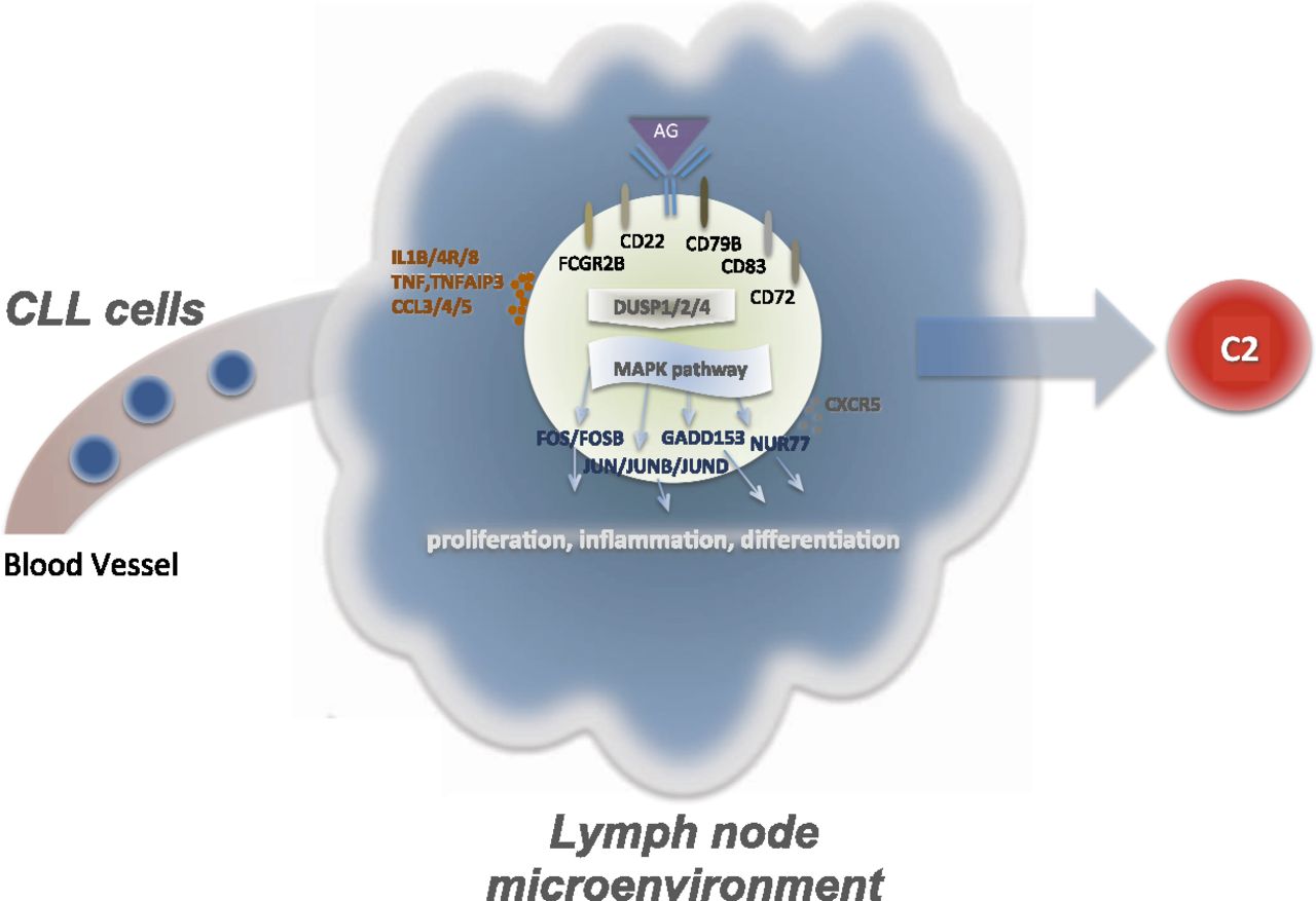 Interaction of CLL cells and the lymph node microenvironment. Stimulation of the BCR complex and other receptor and cell surface genes (CD79B, CD22, CD83, FCRG2B) leads to downstream changes in regulation. Affected genes such as those of the DUSP family, involved in the regulation of the MAPK pathway, may explain transcriptional differences observed for this pathway. Up-regulation of transcriptional regulators, like FOS and JUN, may trigger proliferation and inflammation processes that could be at the origin of C2 cells. Other genes involved in cell–cell signaling are also up-regulated in C2.