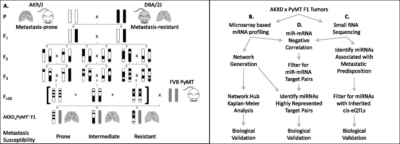 Genome-wide strategy to identify metastasis susceptibility co-expressed networks and their post-transcriptional regulators. (A) The pre-existing AKXD recombinant inbred (RI) panel was constructed by breeding metastasis-prone inbred mice from the AKR/J background to metastasis-resistant DBA/2J mice. F1 progeny from the AKR/J and DBA/2J cross were intercrossed; F2 progeny were bred to homozygosity, generating 24 isogenic AKXD sublines. Crossing each AKXD subline to the MMTV-PyMT model for highly metastatic breast cancer revealed phenotypic diversity in metastatic susceptibility within the AKXD RI panel. (B) RNA purified from AKXD subline primary tumors was subjected to global mRNA profiling by microarray followed by WGCNA and Kaplan-Meier Analysis to identify metastasis-associated co-expressed transcriptional modules. (C) AKXD subline tumor RNA was also subjected to small RNA sequencing followed by miRNA expression-phenotype correlations and eQTL analysis to identify metastasis susceptibility miRNAs. (D) Workflow illustrating analytic integration of global mRNA and miRNA profiling methods to uncover candidate post-transcriptional regulators of co-expressed networks.
