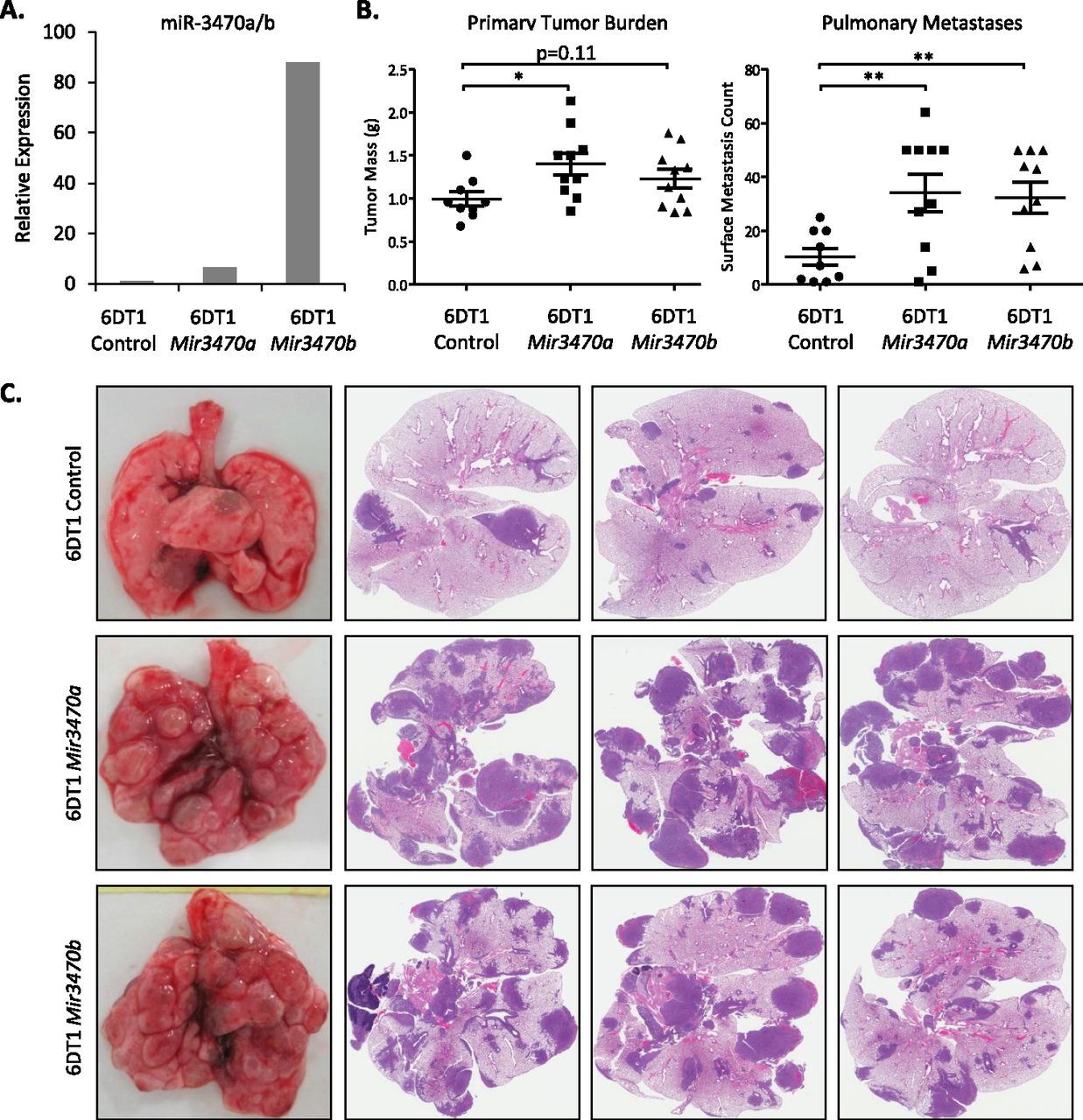 Mir3470a and Mir3470b promote metastatic progression. (A) Stable transduction of Mir3470a and Mir3470b in 6DT1 cells. (B) Orthotopic implantation of 6DT1 cells overexpressing Mir3470a showed 40% increase in tumor mass (P = 0.014) and 230% increase in pulmonary metastasis (P = 0.0069). Overexpression of Mir3470b resulted in 213% increase in pulmonary metastasis (P = 0.088; ncontrol = 9 mice, nMir3470a = 10 mice, nMir-3470b = 10 mice). (C) Representative H&E stained lung sections from mice implanted with control or cells overexpressing Mir3470a/b. (*) P < 0.05, (**) P < 0.01.