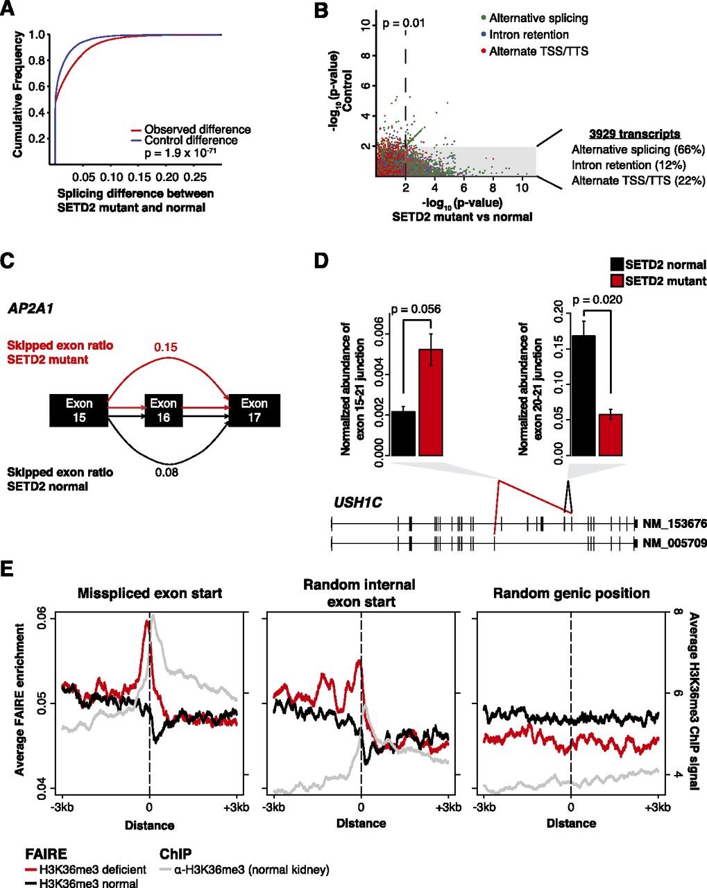 Widespread RNA processing defects linked with SETD2 mutations persist in the mature RNA pool and are marked by altered chromatin accessibility. (A) Splicing differences (see Methods) between SETD2-mutant and SETD2-normal tumors (red) compared with a permuted control (blue) are plotted as a cumulative distribution function. (B) Significance of the difference in ratios between SETD2-mutant and SETD2-normal tumors (x-axis) plotted against the scrambled control (y-axis). Points are colored by the class of RNA processing aberrancy. (Gray box) Significance (P = 0.01) in the SETD2-mutant–normal comparison, but not significant in the control comparison. The percentages of significant differences in transcript processing are also presented. (C) Schematic of AP2A1 splicing. Exon skipping was represented as the ratio of included exon coverage to the sum of the exon and the spliced form. The skipped exon ratio is provided for SETD2-mutant tumors (red) and SETD2-normal tumors (black). (D) Quantitative PCR across two USH1C alternative exon utilization sites identified by RNA-seq for three SETD2-normal tumors (black) and two SETD2-mutant tumors (red). Error bars represent standard error. (E) FAIRE signal plotted around the exon start (±3 kb) of misspliced exons (left), random internal exon starts (middle), and random genic positions (right) for H3K36me3-deficient tumors (red) and H3K36me3-normal tumors (black). (Gray) H3K36me3 ChIP-seq signal from normal kidney tissue.