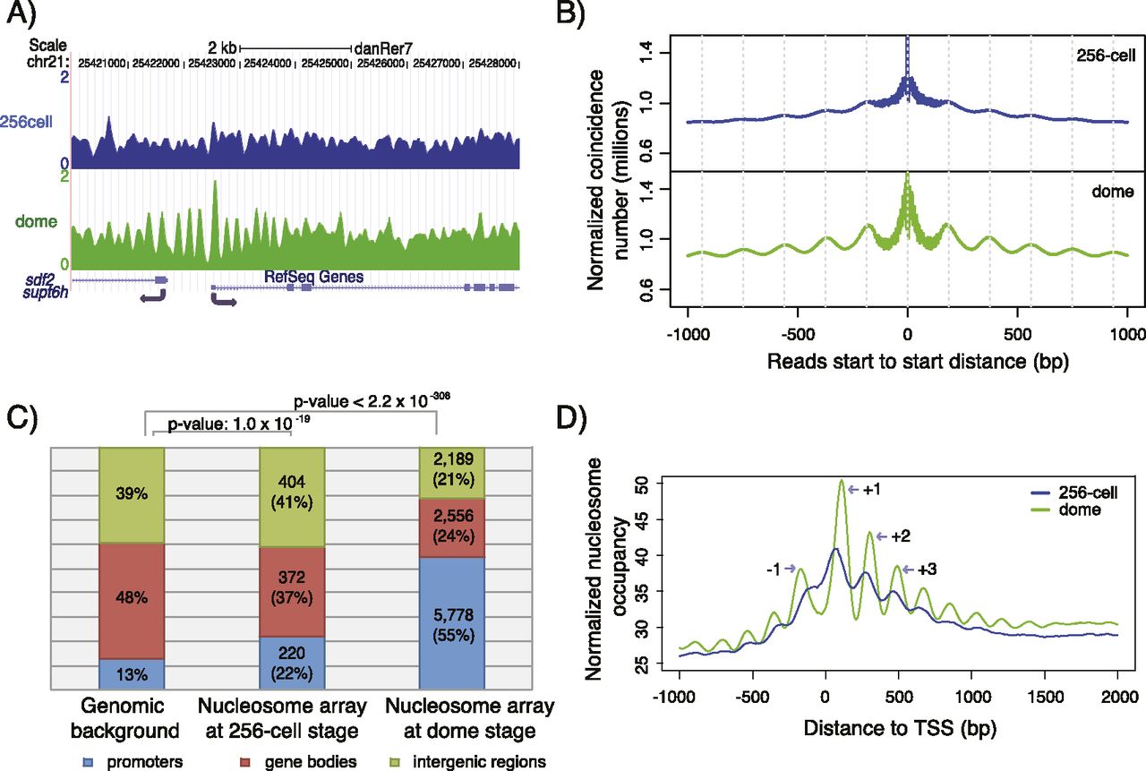 Well-positioned nucleosome arrays are established at promoters during genome activation. (A) Sample profile of nucleosome organization around the promoter of supt6h at the 256-cell (blue, before the maternal-zygotic transition) and dome (green, after the maternal-zygotic transition) stages. Gaussian smoothing of midpoints of nucleosomal DNA was used to create the nucleosome profile. (B) Relationship between the position of adjacent nucleosomes before (blue) and after (green) the maternal-zygotic transition. The total number of nucleosomal sequencing reads with a start-to-start distance equal to the value on the x-axis is shown. (C) Genomic distribution of well-positioned nucleosome arrays at the 256-cell and dome stages. Promoters: regions from 2 kb upstream of the TSS to 2 kb downstream from the TSS. Gene bodies: regions from 2 kb downstream from the TSS to the transcription termination sites (TTS). Intergenic regions: all other genomic regions. (D) Average promoter nucleosome organization across all genes before (blue) and after (green) the maternal-zygotic transition. All reads were extended to 147 bp; the middle 73 bp were taken, piled up, and normalized by sequencing coverage. The +1, +2, +3, and −1 nucleosomes around TSS at the dome stage are indicated.