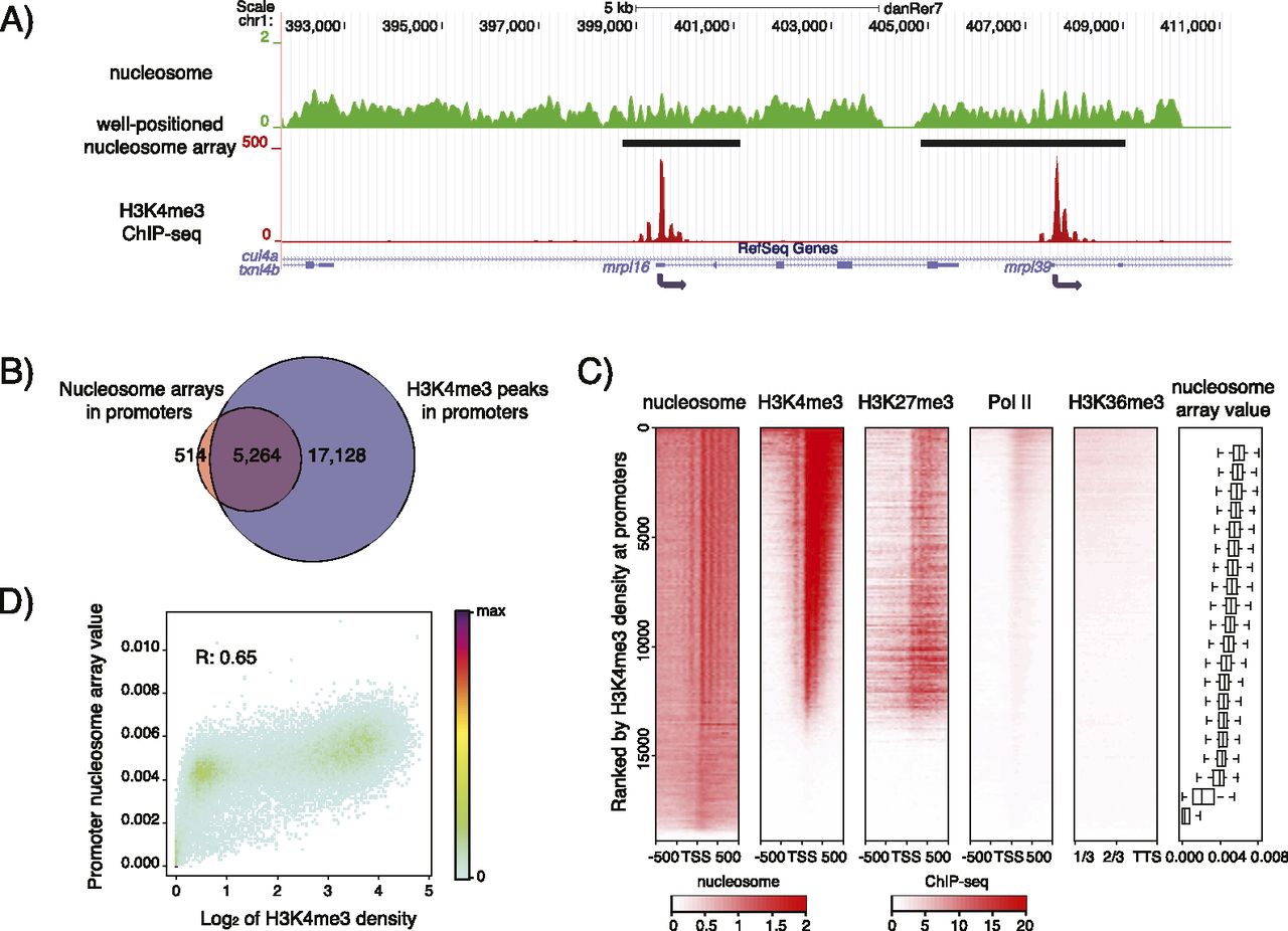 Well-positioned nucleosome arrays and H3K4me3 co-occur at promoters at the dome stage. (A) Sample profile of nucleosome organization (green) and H3K4me3 (red) around mrpl16 and mrpl39. Gaussian smoothing of the midpoints of nucleosomal DNA was used to represent the nucleosome profile. Identified well-positioned nucleosome arrays are indicated by black bars. (B) Venn diagram showing the overlap of well-positioned nucleosome arrays and H3K4me3 peaks at promoters. A 100-bp overlap was used as a minimal required cutoff. (C) Heatmaps of nucleosome organization; H3K4me3, H3K27me3, and RNA Pol II signals around TSSs; as well as the H3K36me3 signal in the last 2/3 regions of the concatenated exons. Genes are ranked by the H3K4me3 signal at their promoter. Each horizontal line represents the average signal for 100 genes. Color represents RPKM value. Genes were evenly grouped into 20 bins based on H3K4me3 density at their promoters, and the associated distribution of nucleosome array values at these promoters is given in the boxplot. In heatmaps, short genes (<1 kb) were excluded, and if one gene has multiple annotations, only the one with the strongest H3K4me3 signal was kept. A total of 18,890 genes was used. (D) The correlation between H3K4me3 density and nucleosome array value at the promoters. H3K4me3 density is calculated as the log2 transformed RPKM + 1 for each promoter.