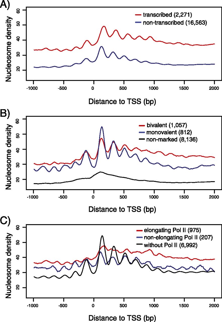 Canonical nucleosome organization at promoters in the absence of transcriptional elongation. (A) Average promoter nucleosome organization for transcribed (red) and nontranscribed (blue) genes. Transcription status is inferred from H3K36me3 ChIP-seq enrichment in exons and RNA Pol II ChIP-seq enrichment in gene bodies. (B) Average promoter nucleosome organization for three types of nontranscribed genes: bivalent (marked by both H3K4me3 and H3K27me3 at promoters; red), monovalent (marked by H3K4me3, but not by H3K27me3 at promoters; blue) and nonmarked (marked neither by H3K4me3 nor by H3K27me3 at promoters; black) genes. (C) Average promoter nucleosome organization for three types of genes: with elongating Pol II (red), with nonelongating Pol II (blue), and with H3K4me3 at promoters but without Pol II (black). (A–C) All reads were extended to 147 bp; the middle 73 bp were taken, piled up, and normalized by sequencing coverage. Number of genes used to draw an average profile was indicated for each class. Short genes (<1 kb) were excluded. The accompanying nucleosome profiles for each class of genes in the normalized version and at the 256-cell stage are shown in Supplemental Figure S10.
