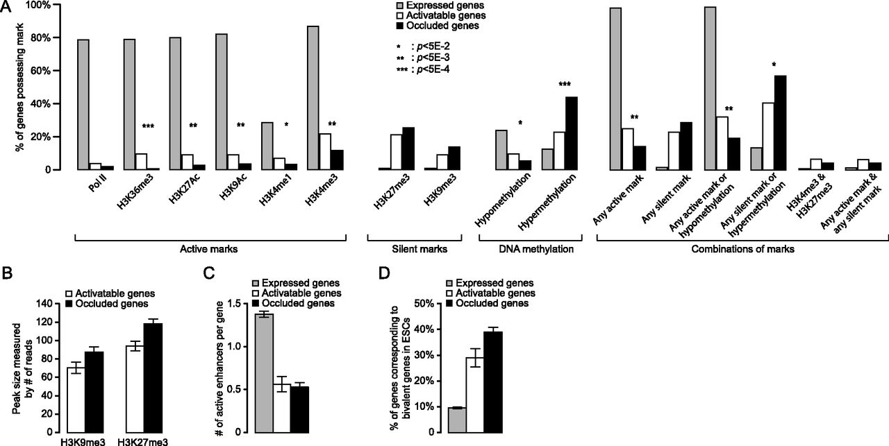 Chromatin signatures of different classes of genes. (A) Enrichment of specific chromatin marks or combination of marks (including DNA methylation) in expressed, activated, and occluded genes. Asterisks indicate that activatable and occluded genes are statistically different for a mark or combination of marks, with P-values calculated by two-tailed Fisher's exact test. (B) Occluded genes tend to have larger enrichment peaks than activatable genes for H3K9me3 and H3K27me3. (C) Expressed genes have a more average number of predicted active enhancers than silent genes. (D) More occluded than activatable genes correspond to genes possessing bivalent promoters in ESCs (Bernstein et al. 2006).